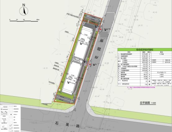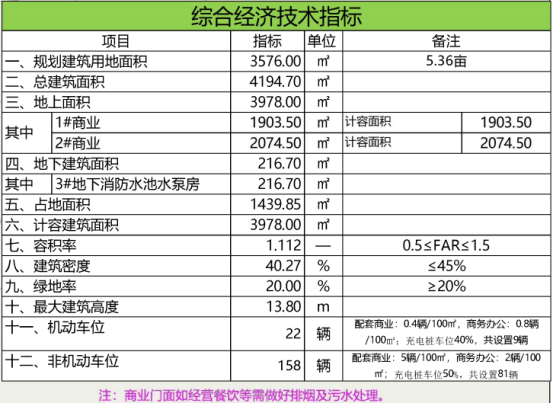规划地段位于寿县炎刘镇石吴路与花园街道路交叉口西北侧。规划总用地面积3576平方米,总建筑面积4194.70平方米,总计容建筑面积3978平方米,地下建筑面积216.70平方米,1#商业建筑面积1903.50平方米(计容面积1903.50平方米),2#商业建筑面积2074.50平方米(计容面积2074.50平方米),3#地下消防水池水泵房建筑面积216.70平方米,建筑密度40.27%,容积率1.112,绿地率20%,配建机动车停车位22个(9个充电桩车位),非机动车停车位158个(81个充电桩车位)。