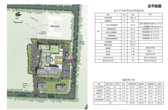 规划地段位于众兴镇G327国道与众太路交口西南范围内。规划总用地面积10001.84平方米,总建筑面积6459.00平方米,其中门诊综合楼建筑面积5785.89平方米(含地下消防泵房及水池345.11平方米,计容建筑面积5388.09平方米),后勤楼建筑面积353.19平方米(计容建筑面积345.98平方米),发热门诊建筑面积225.70平方米(计容建筑面积222.04平方米),门房建筑面积63.76平方米(计容建筑面积61.85平方米),垃圾暂存房建筑面积30.46平方米(计容建筑面积29.14平方米),总计容建筑面积6047.10平方米,容积率0.605,建筑密度27.86%,绿地率40.00%。机动车停车位40个(充电桩车位16个),非机动停车位134个(电动自行车位67个)。