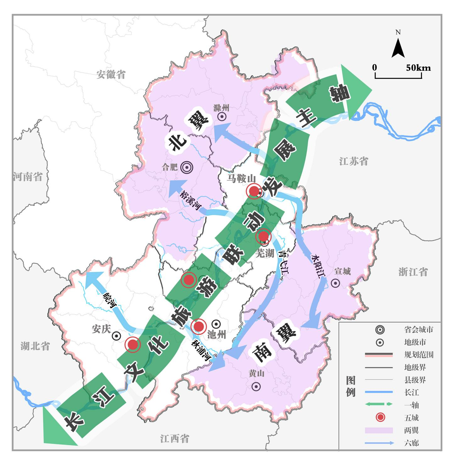 以长江安徽段干流沿线五市为核心,辐射长江安徽段流域其他四市,结合文化旅游资源分布、产业发展基础,依托地理空间和区位特点,科学统筹全域文旅发展,突出长江文化旅游发展主轴联动作用,引领沿江城市文化旅游发展,着力构建“一轴五城两翼六廊”发展格局。