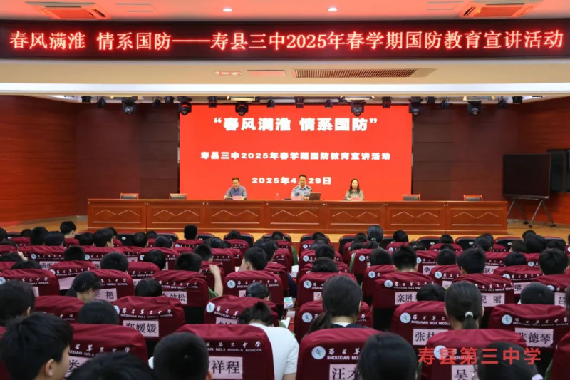 青春逢盛世,齐力筑国防。为增强青少年国防意识,厚植家国情怀,4月29日下午,寿县三中特邀寿县人武部政委张海深开展了“春风满淮 情系国防”2025年春学期国防教育宣讲活动。七年级近500名师生代表齐聚报告厅,共同聆听国防故事,感悟强军使命。寿县三中校长杨高虹,副校长姚传柱等领导参加活动,活动由姚传柱主持。