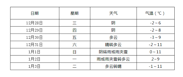【天气预报】预计今天夜里到明天白天:阴,偏北风转偏东风,风力都是2~3级;明天早晨最低气温-2度,明天白天最高气温6度。预计12月29日:阴。