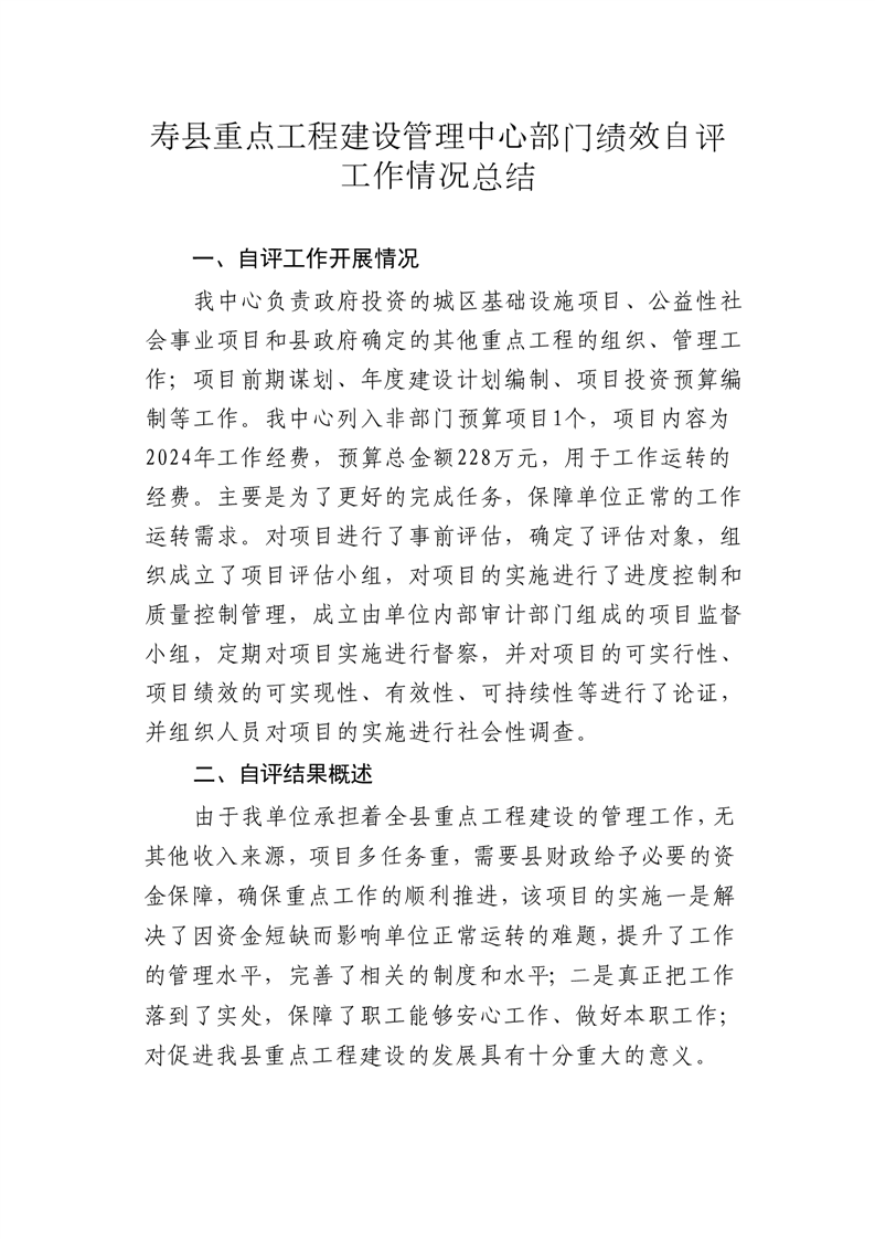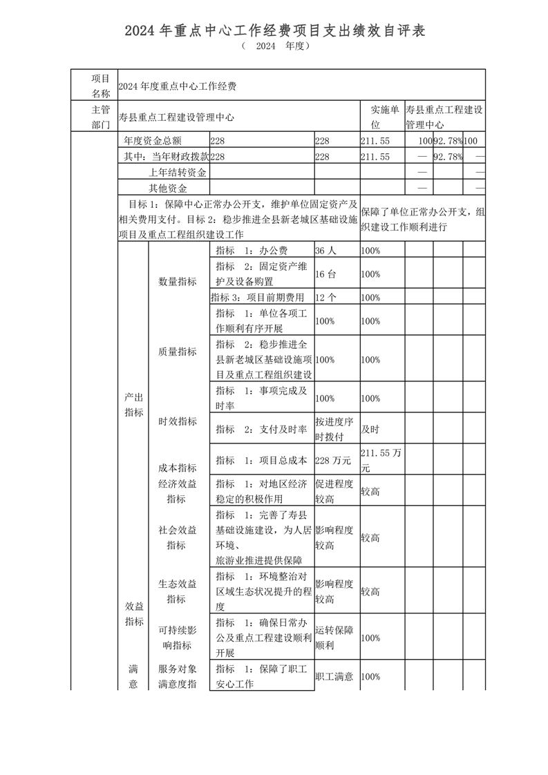 寿县重点中心2024年部门绩效自评工作情况及自评表