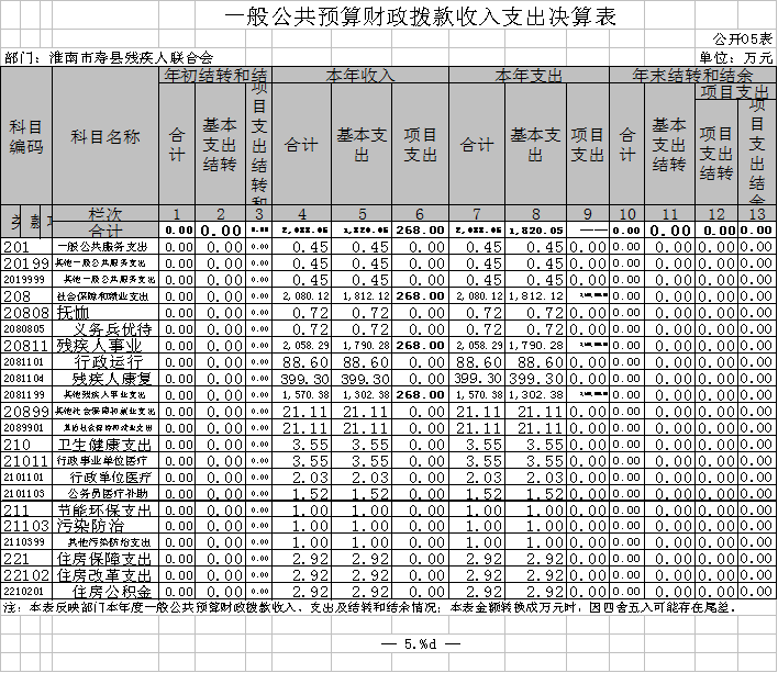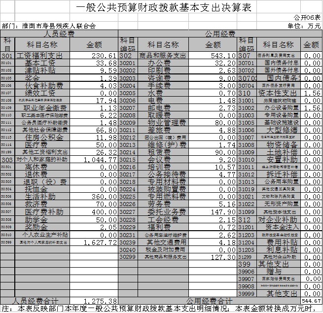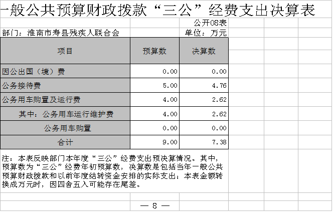 为落实2019年政府决算、部门决算及“三公”经费预算信息公开的通知精神,现将寿县残疾人联合会2019年部门决算及“三公”经费信息报告如下。
