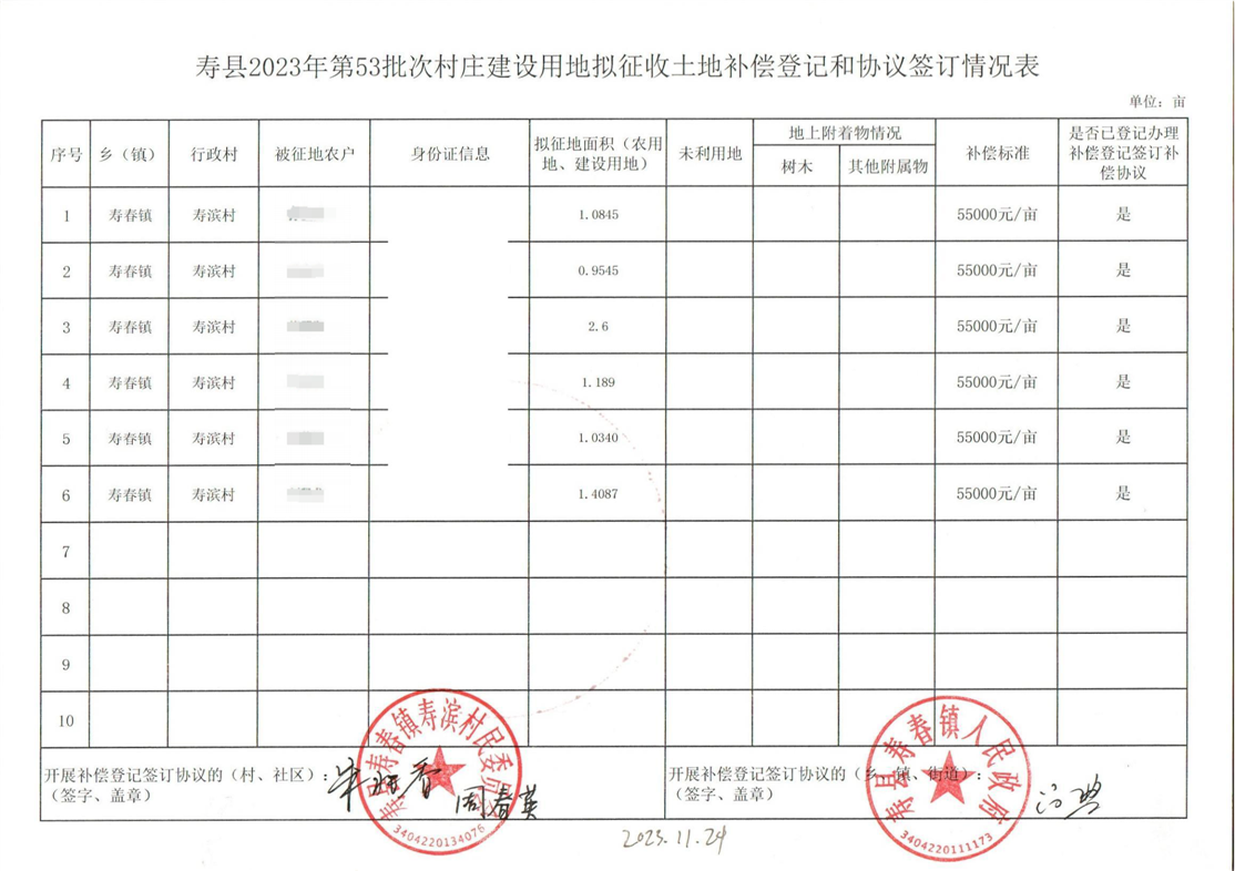 寿县2023年第53批次(增减挂钩)城镇建设用地协议签订情况表