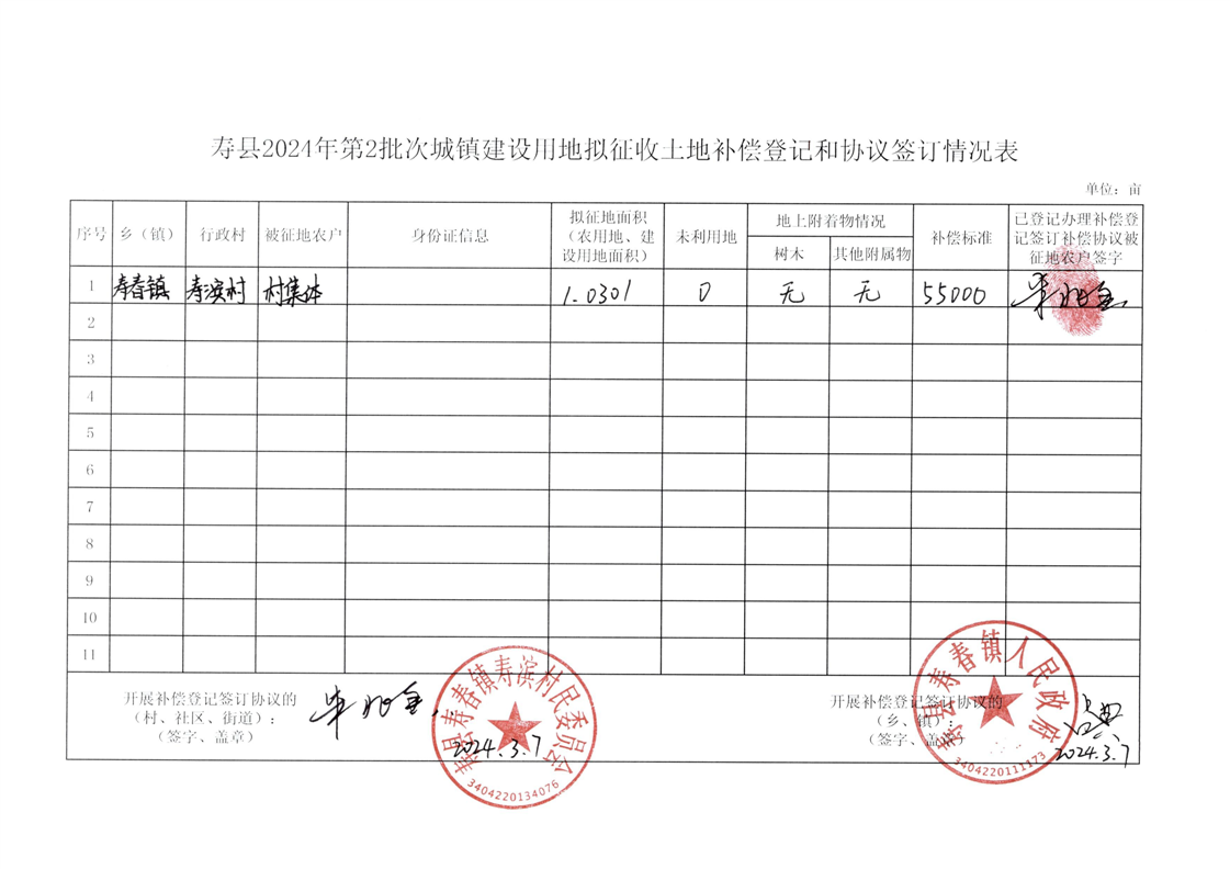 寿县2024年第2批次(增减挂钩)城镇建设用地协议签订情况表
