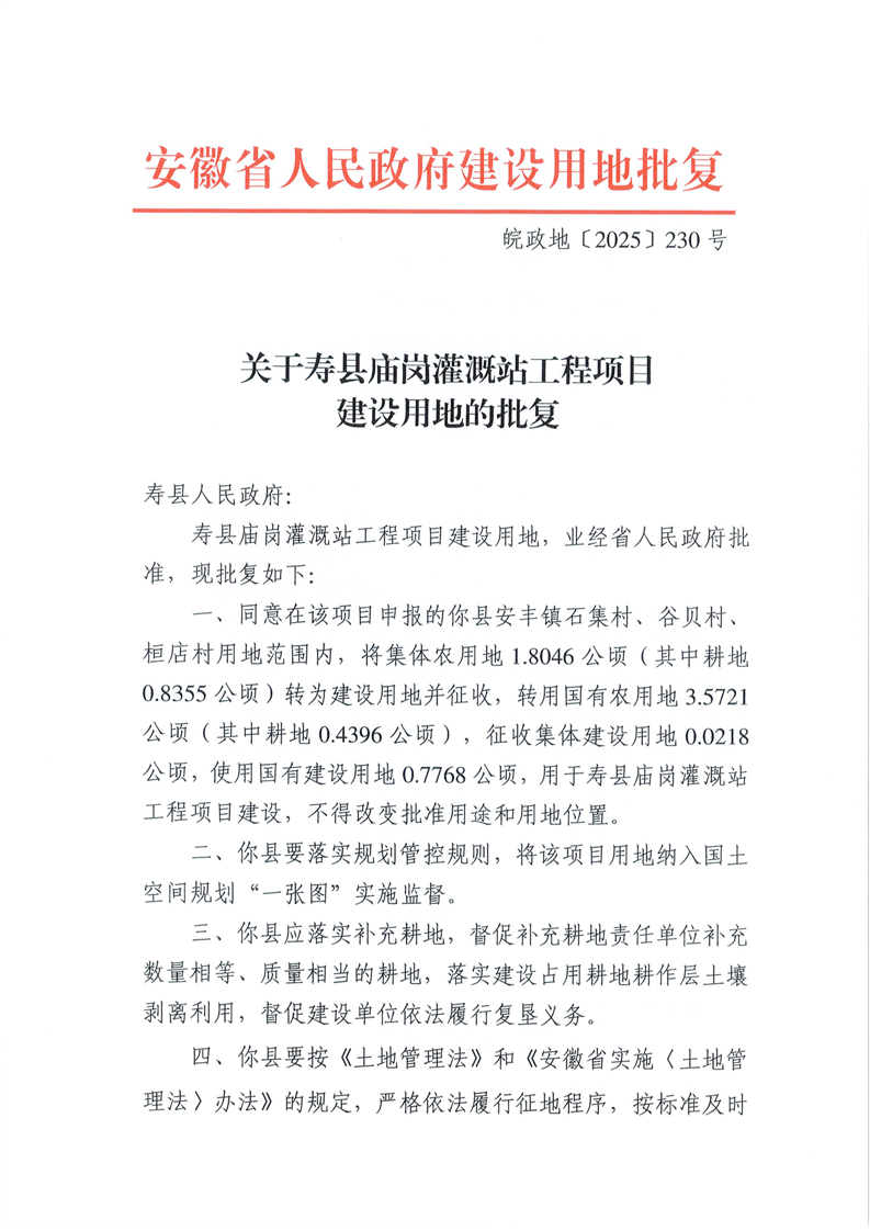 关于寿县庙岗灌溉站工程项目建设用地的批复