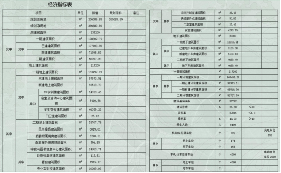 该规划地段位于安康大道与丰收大道交叉口西南角。规划总用地面积266689.89平方米,地块总建筑面积237200平方米,项目总计容建筑面积217200平方米,其中一期已建建筑面积107103.89平方米,一期新建建筑面积71698.83平方米,其中一期新建地上建筑面积65518.70平方米(B3实训楼建筑面积14023.46平方米,学生宿舍建筑面积46059.26平方米,会堂及活动中心建筑面积5410.56平方米,门卫室建筑面积25.42平方米),二期建筑面积58397.28平方米,二期地上建筑面积53707.79平方米,其中配套服务用房建筑面积794.85平方米,风雨操场建筑面积6019.01平方米,后勤附属用房建筑面积5240.31平方米,科教与图书信息中心建筑面积24863.71平方米,垃圾收集占建筑面积117.81平方米,看台建筑面积1915.17平方米,专业实训楼建筑面积10369.03平方米,消防控制室38.48平方米,快递服务点建筑面积50.85平方米,食堂建筑面积4273.15平方米,门卫室建筑面积25.42平方米,总地下建筑面积20000平方米,容积率0.815,建筑密度21.68%,绿地率40.00%,机动车停车位总数629个(充电车位252个),非机动停车位4000个(电动自行车位2000个)。