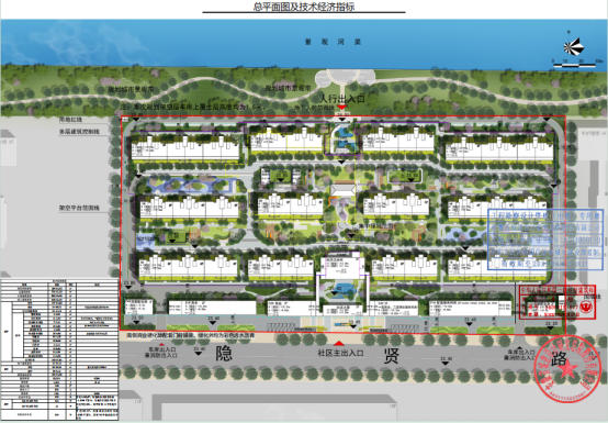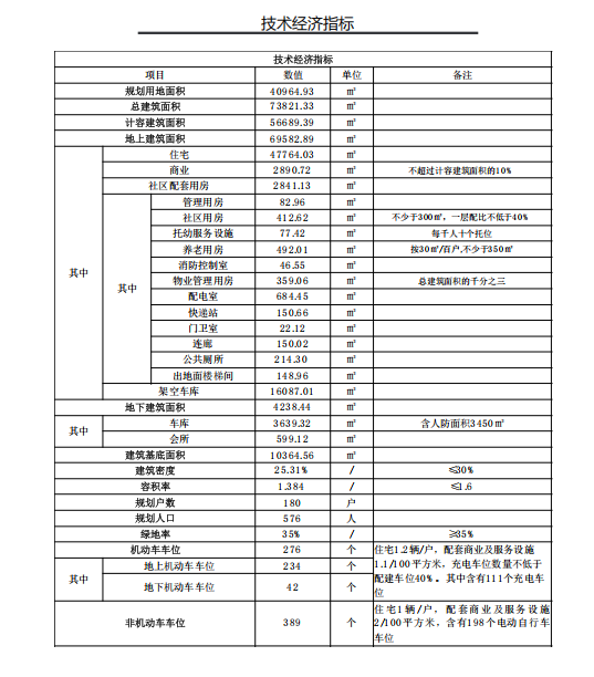 规划地段位于寿县城南新区隐贤路北侧,西侧为寿县第四实验小学,东侧为社会福利用地。规划总用地面积40964.93平方米,总建筑面积73821.33平方米,地上建筑面积69582.89平方米,其中住宅建筑面积47764.03平方米,商业建筑面积2890.72平方米,社区配套用房2841.13平方米,架空车库16087.01平方米(不计入容积率,不计入建筑密度),地下建筑面积4238.44平方米。总计容建筑面积56689.39平方米,容积率1.384,建筑密度25.31%,绿地率35%。机动车停车位276个(充电桩车位111个),非机动车停车位389个(含电动自行车位198个)。