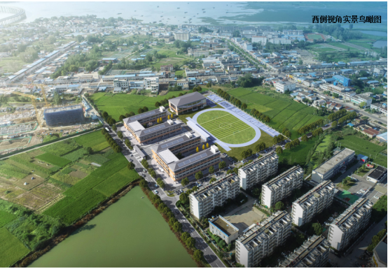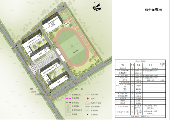 规划地块位于瓦埠镇,距离镇中心2公里处,学苑路东侧、现状渔民新村北侧。规划总用地面积29898.60平方米,总建筑面积15261.57平方米,其中教学楼建筑面积7027.16平方米,综合实验楼建筑面积5291.38平方米,食堂、风雨操场建筑面积2463.94平方米,看台建筑面积228.05平方米,门卫建筑面积37.20平方米。地下建筑面积213.84平方米,总计容建筑面积14898.33平方米,容积率0.499,建筑密度16.66%,绿地率40.00%(含操场人工草皮)。机动车停车位90个(充电桩车位46个),非机动车停车位174个(含87个电动自行车位)。