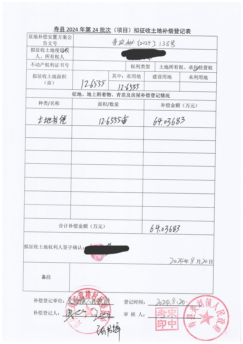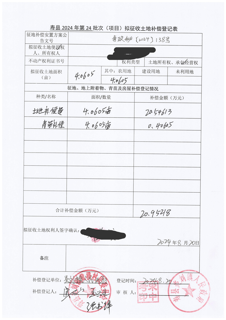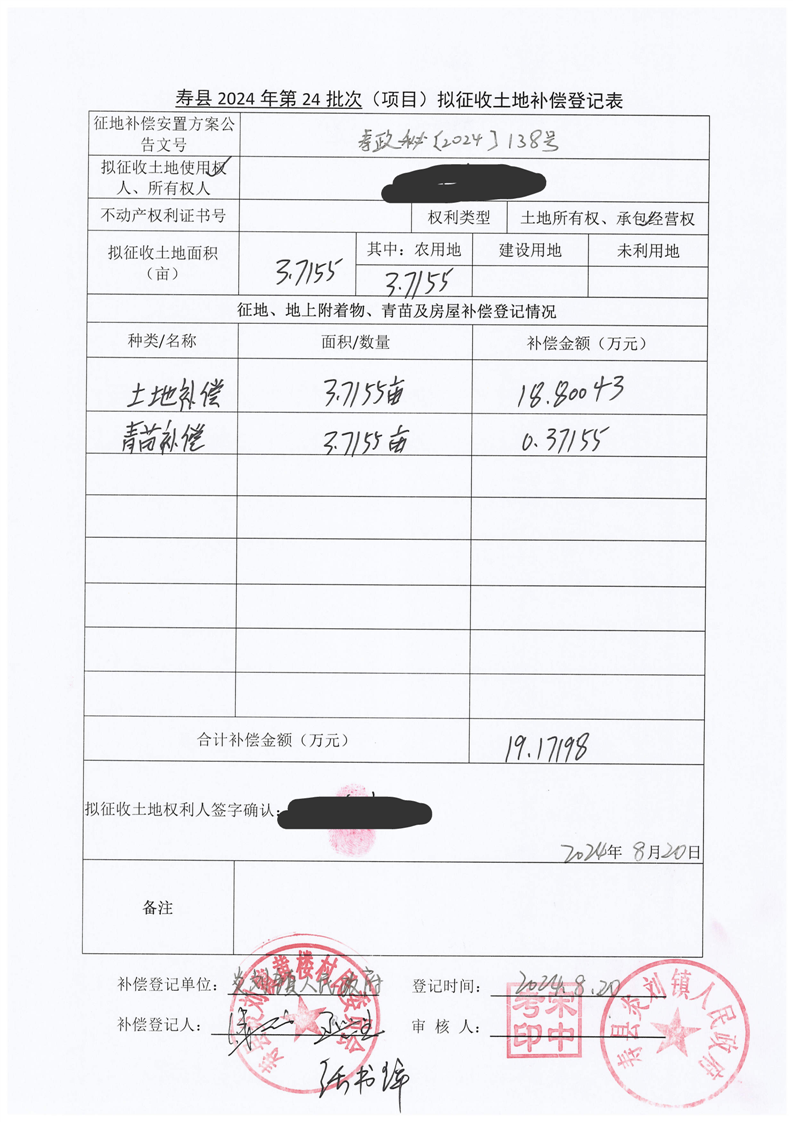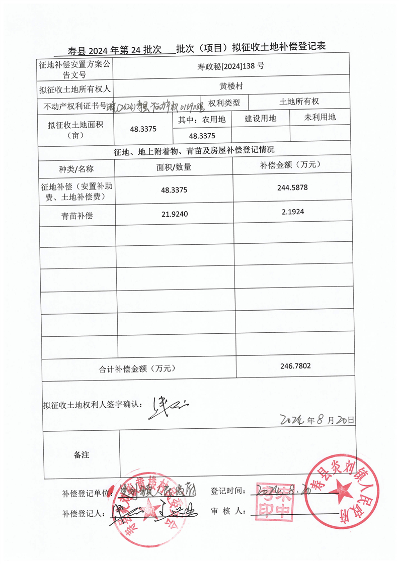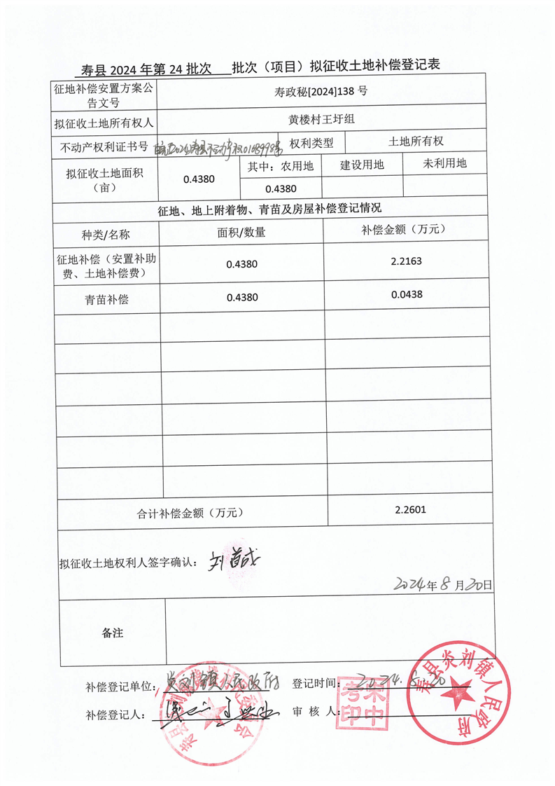 寿县2024年第24批次(增减挂钩)城镇建设用地协议签订情况表