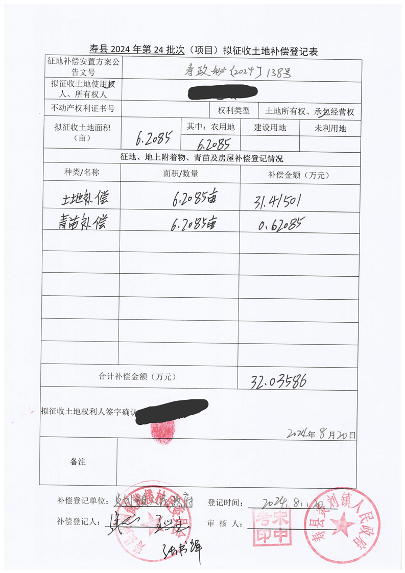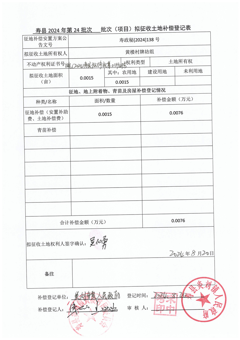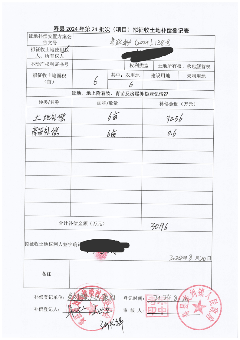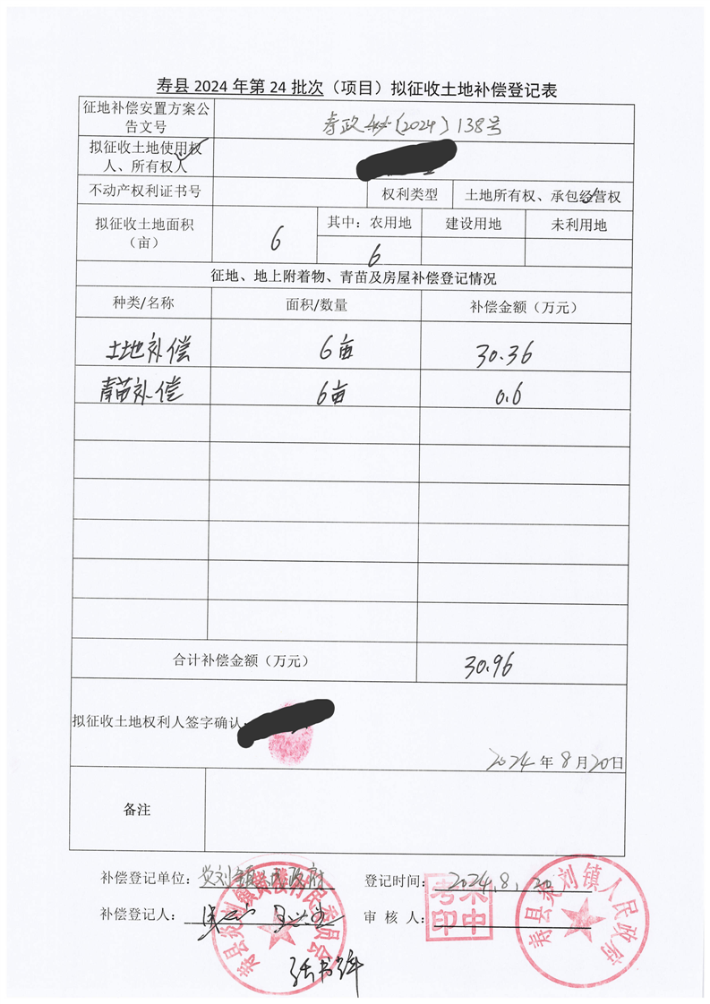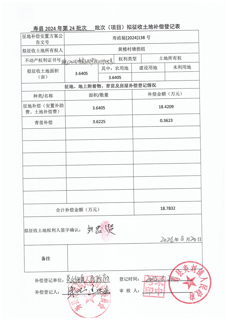 寿县2024年第24批次(增减挂钩)城镇建设用地协议签订情况表