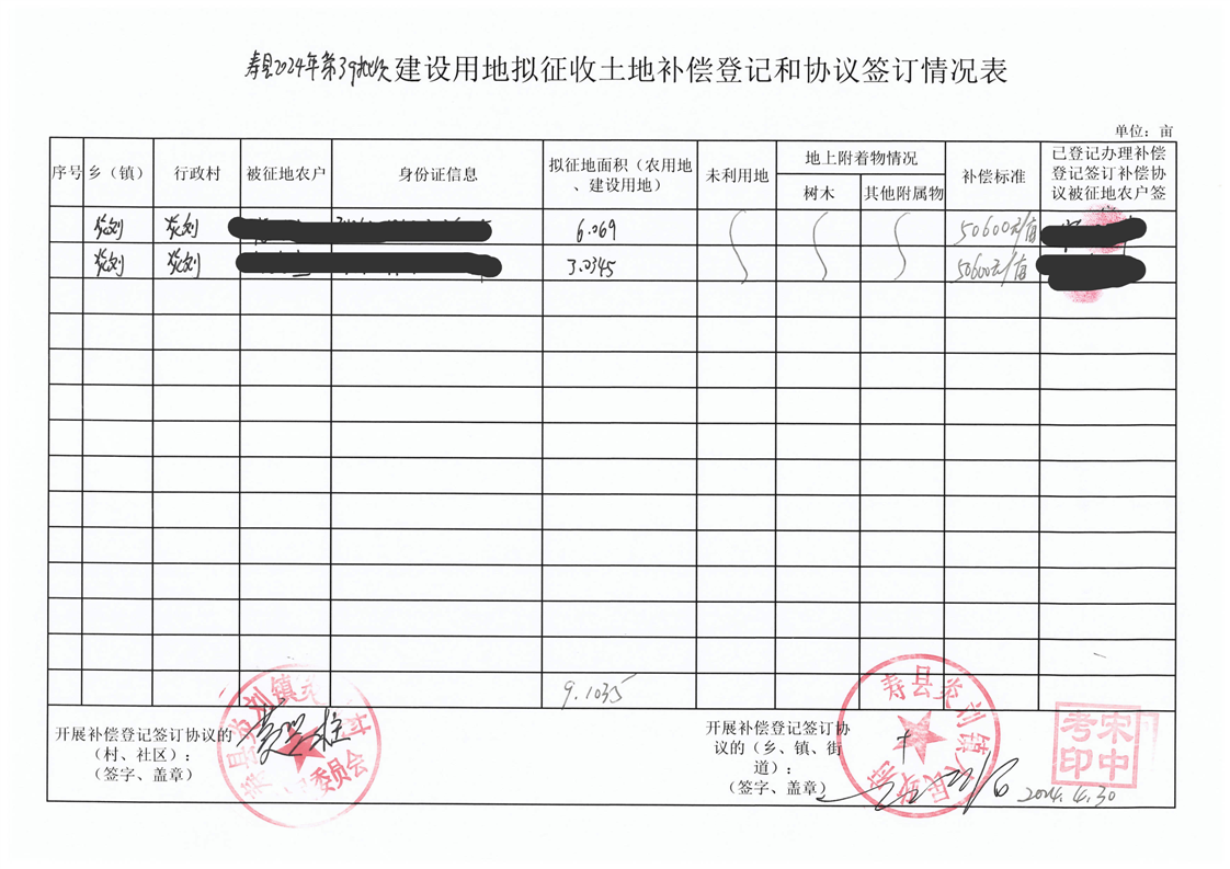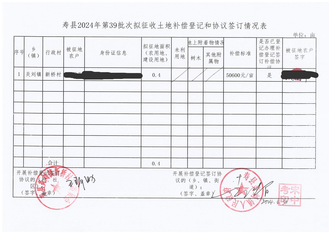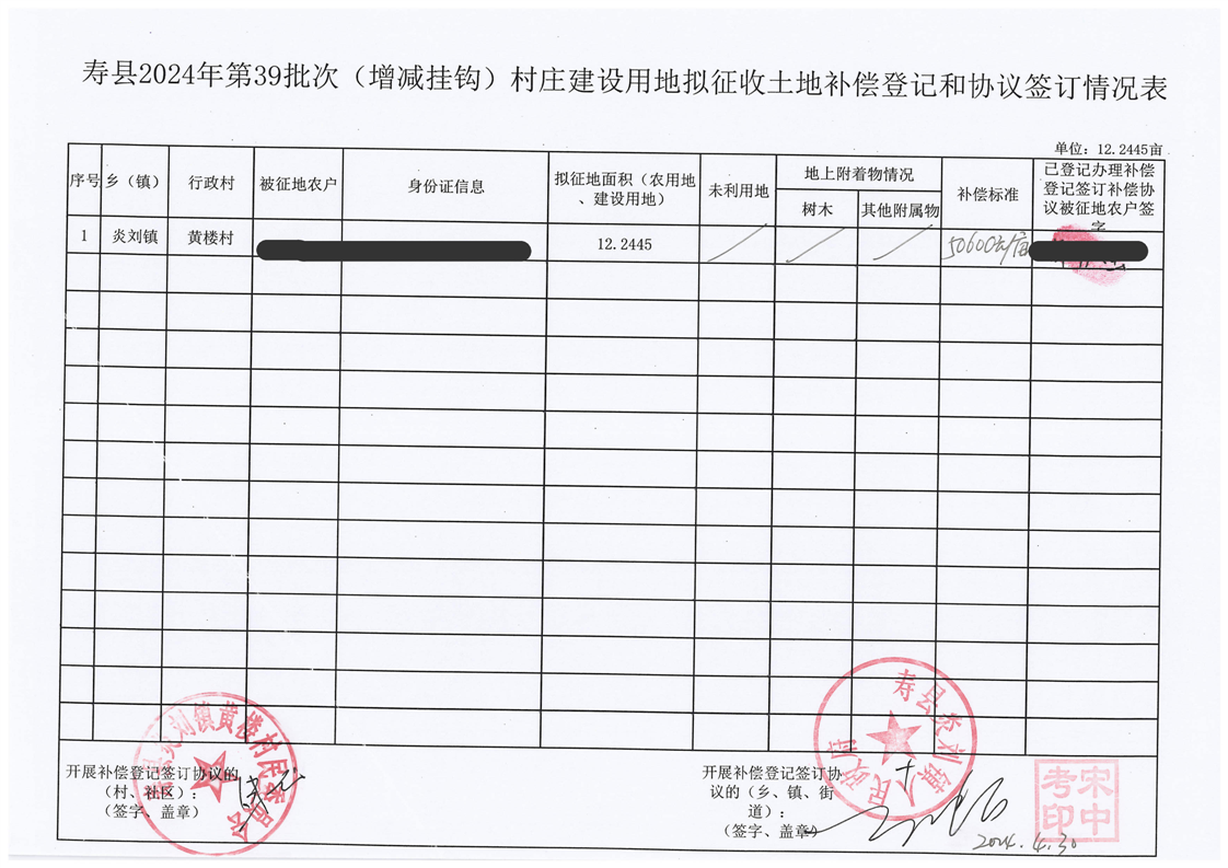 寿县2024年第39批次(增减挂钩)村庄建设用地协议签订情况表