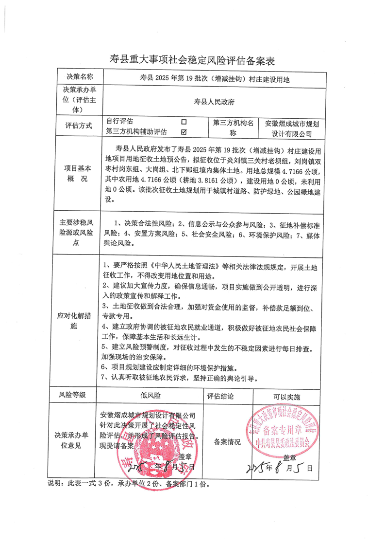 寿县2025年第19批次(增减挂钩)村庄建设用地社会稳定风险评估备案表
