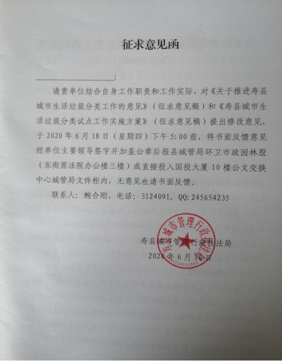 我局拟于6月起草制定2件《关于推进寿县城市生活垃圾分类工作的意见》规范性文件,现已向相关单位发出征求意见函。
