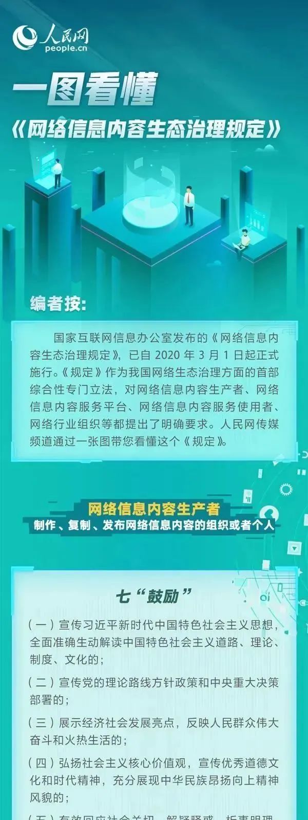 为了营造良好网络生态,保障公民、法人和其他组织的合法权益,维护国家安全和公共利益,构建天朗气清的网络空间,国家互联网信息办公室于2019年12月15日发布《网络信息内容生态治理规定》(以下称:《治理规定》),自2020年3月1日起正式施行。