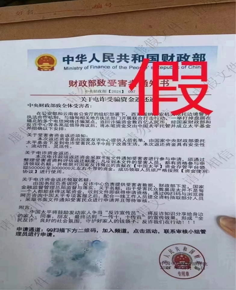 :公安部追回的诈骗资金有数百亿人民币,现在这笔资金已交由中国太平托管,凡是收到此文件的电信网络诈骗的受害者均可申请资金返还,同时有对国家反诈作出贡献的人员还可以申请领取50万至300万不等的资金,由于受骗民众数量庞大,只有收到文件的群众才有申请资格,通过扫描文件下方二维码即可参与申请。