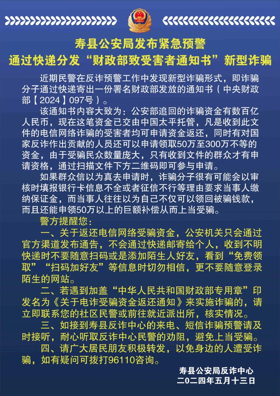 近期民警在反诈预警工作中发现新型诈骗形式,即诈骗分子通过快递寄出一份署名财政部发放的通知书(中央财政部【2024】097号)。