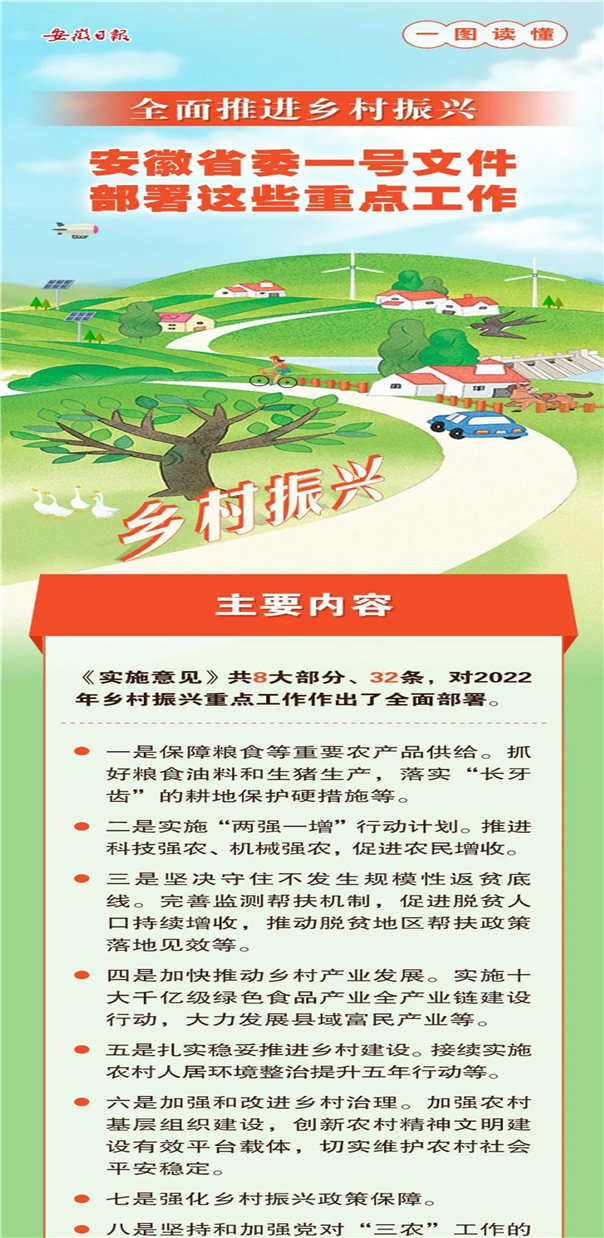 日前,省委、省政府公开发布了《中共安徽省委 安徽省人民政府关于做好2022年全面推进乡村振兴重点工作的实施意见》。《实施意见》主要内容是什么?对全面推进乡村振兴重点工作又做了哪些安排?