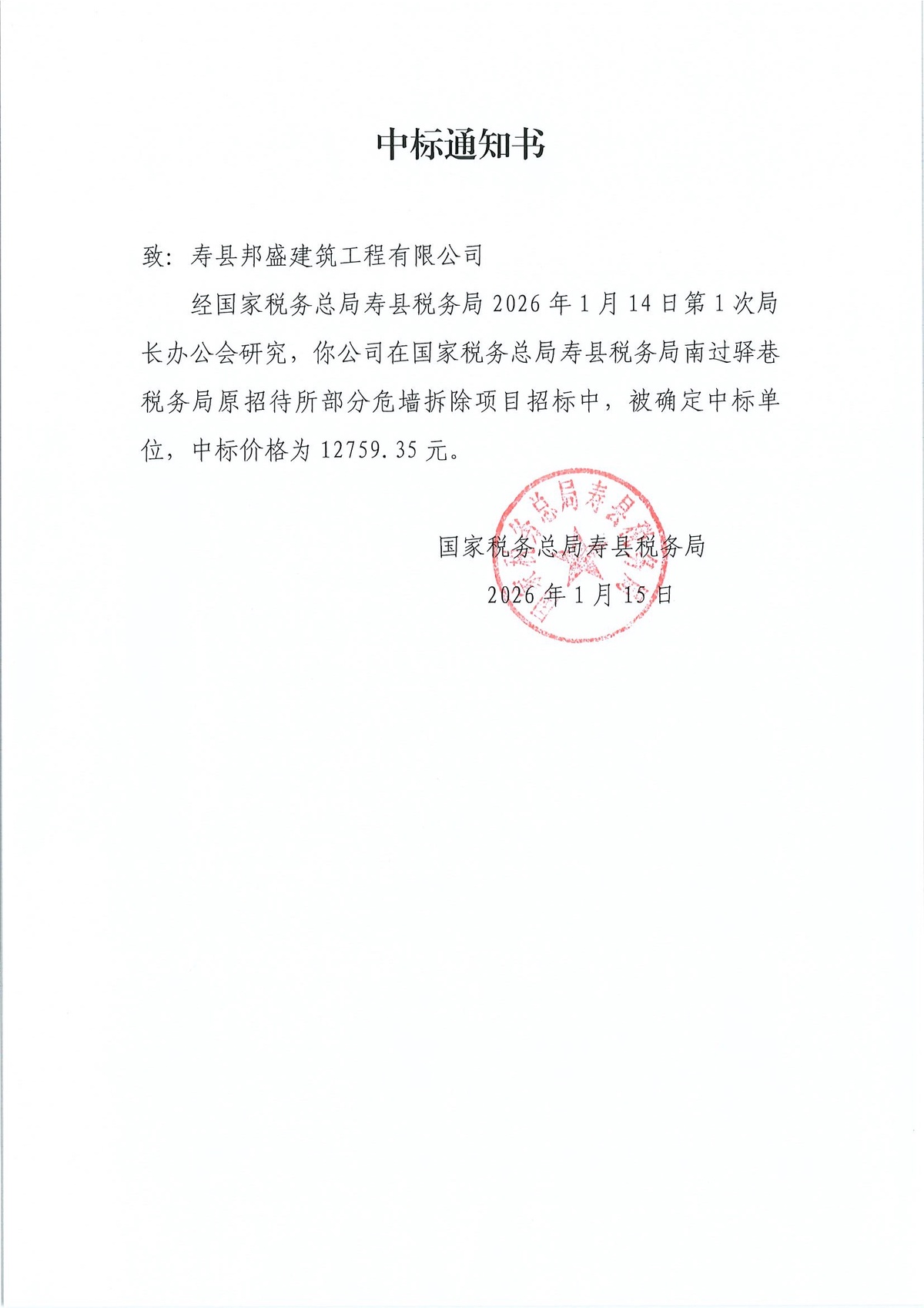 寿县税务局南过驿巷原招待所部分危墙拆除项目采购结果公示
