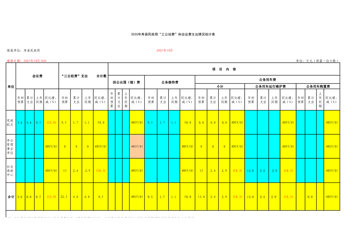 2025年10月寿县民政局“三公”经费和会议费支出情况统计表