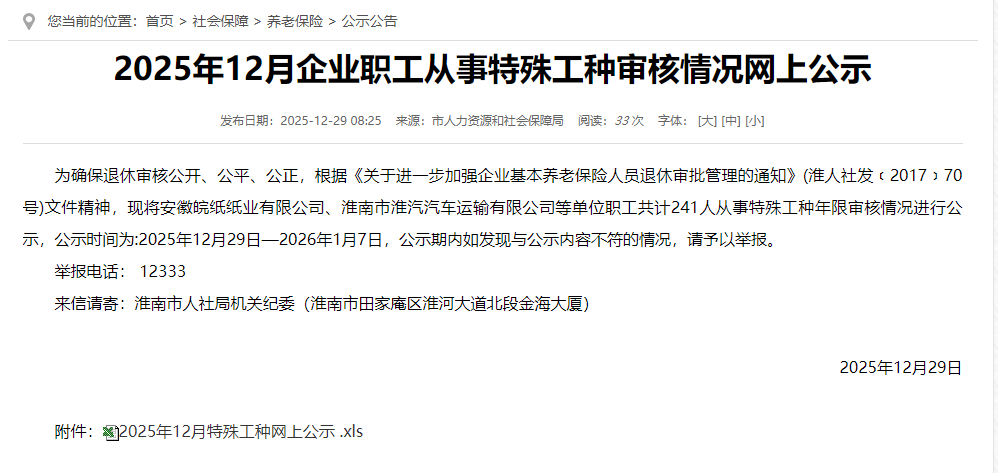 2025年12月企业职工从事特殊工种审核情况网上公示