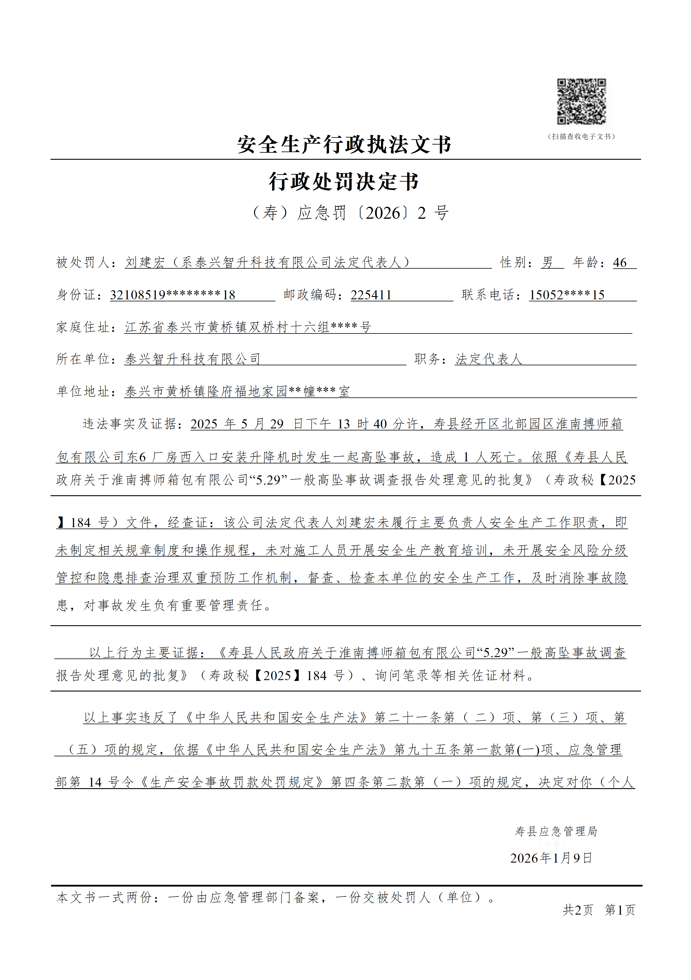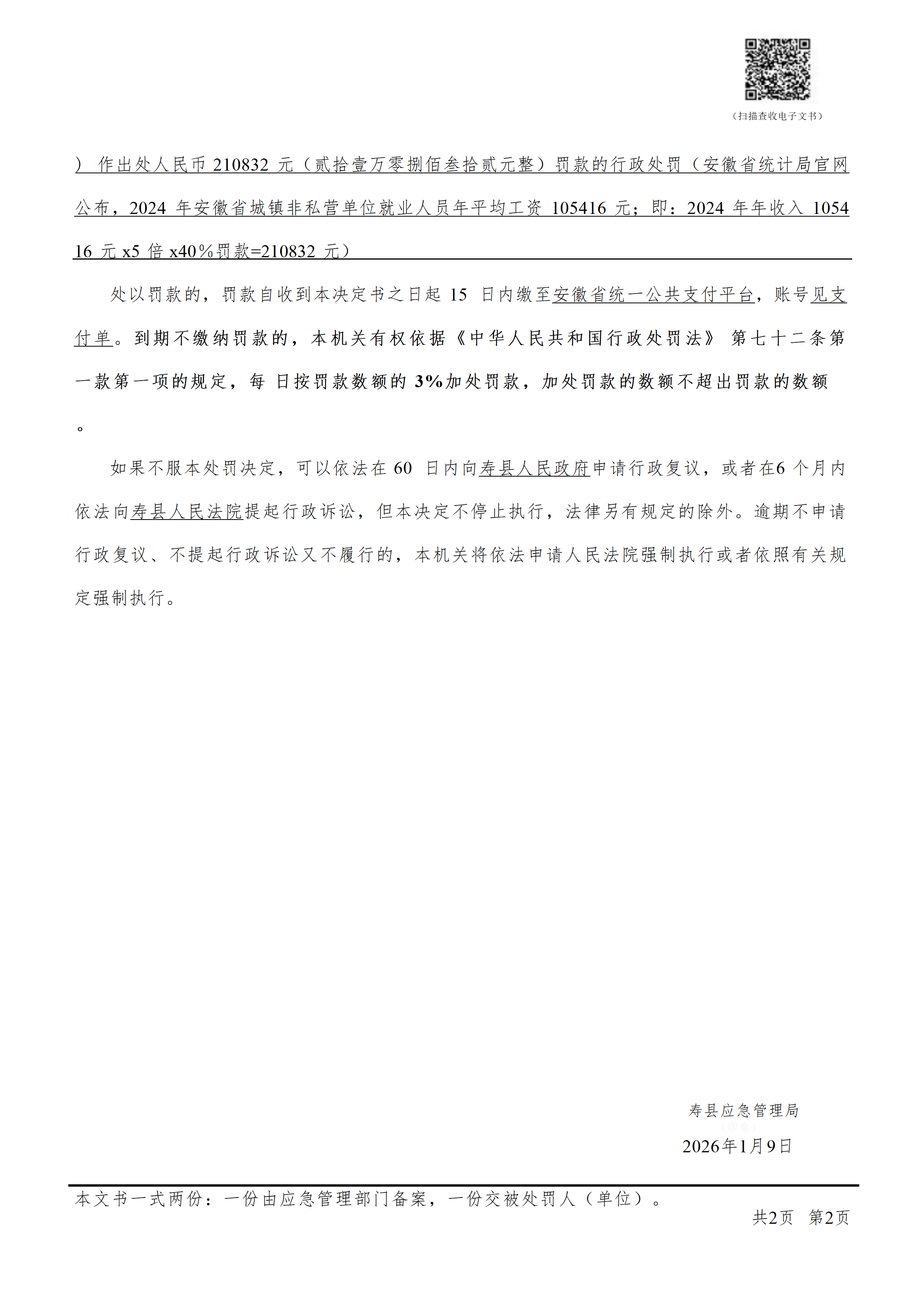 行政处罚决定书(寿)应急罚〔2026〕2号