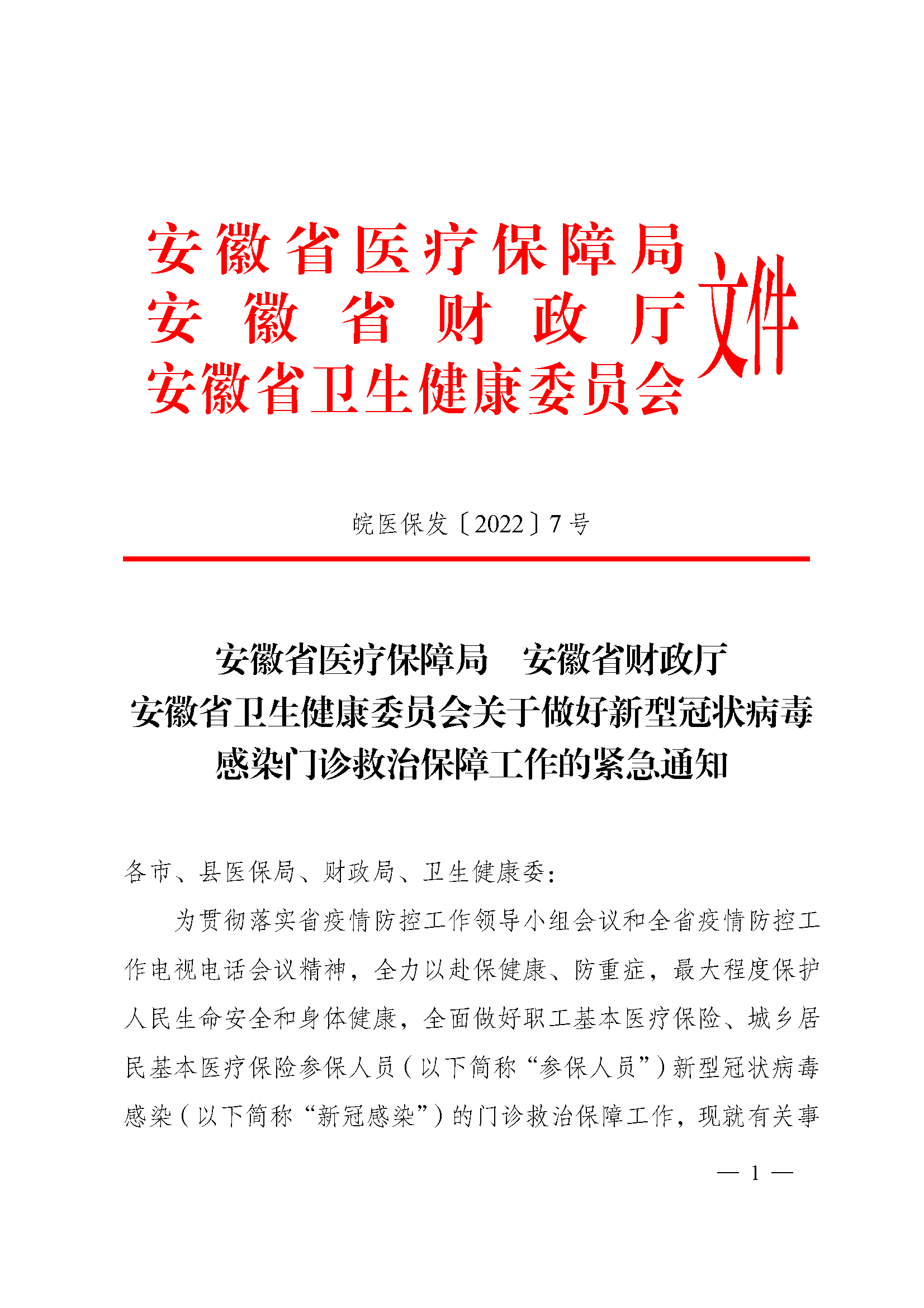 | 名称: | 安徽省医疗保障局安徽省财政厅安徽省卫生健康委员会关于做好新型冠状病毒感染门诊救治保障工作的紧急通知 | 点击量: | |