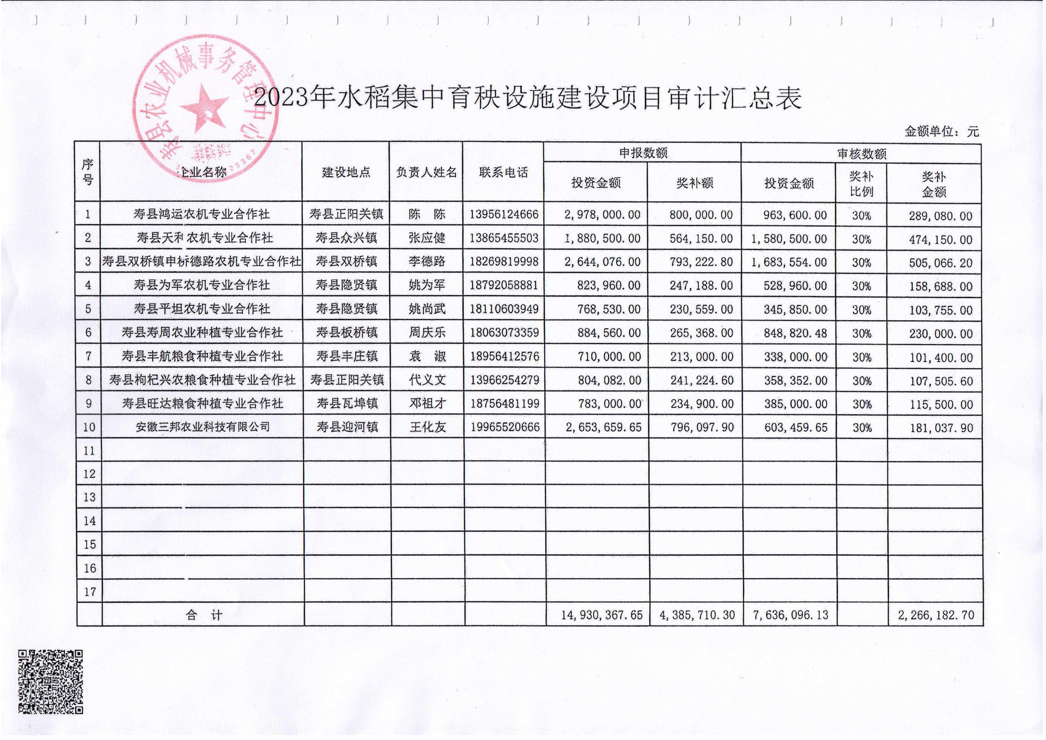 经中心党委研究决定,现将2023年水稻集中育秧设施建设项目拟奖补情况(第五批)进行公示,公示期为2025年9月22日至2025年9月28日,公示期内如有异议,请及时联系寿县农业机械事务管理中心,联系人:姜俊才,联系电话:0554-3122222。