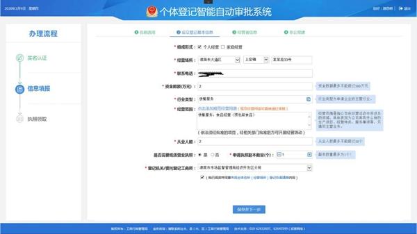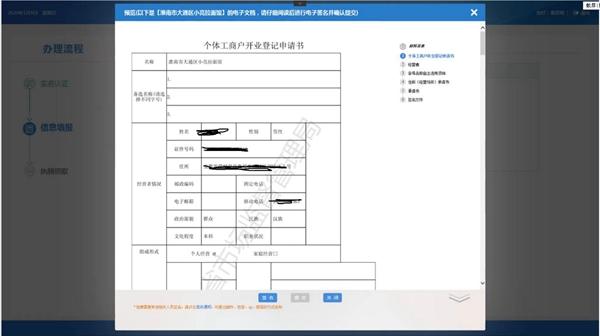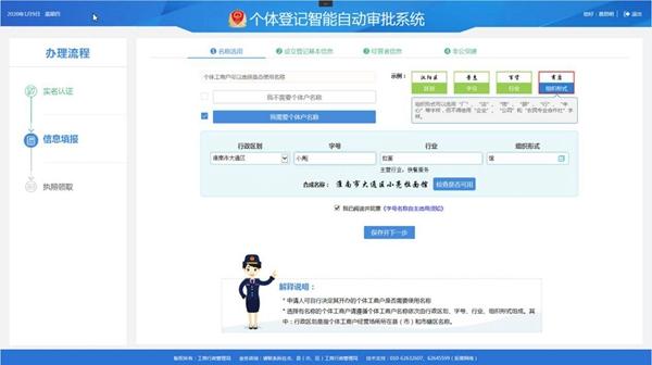 1.名称选用,实名认证通过后进入到业务流程办理界面,选择办理人所在的行政区划,填入字号,行业以及组织形式。注意在选择行业类型时,需要选择主营业务。