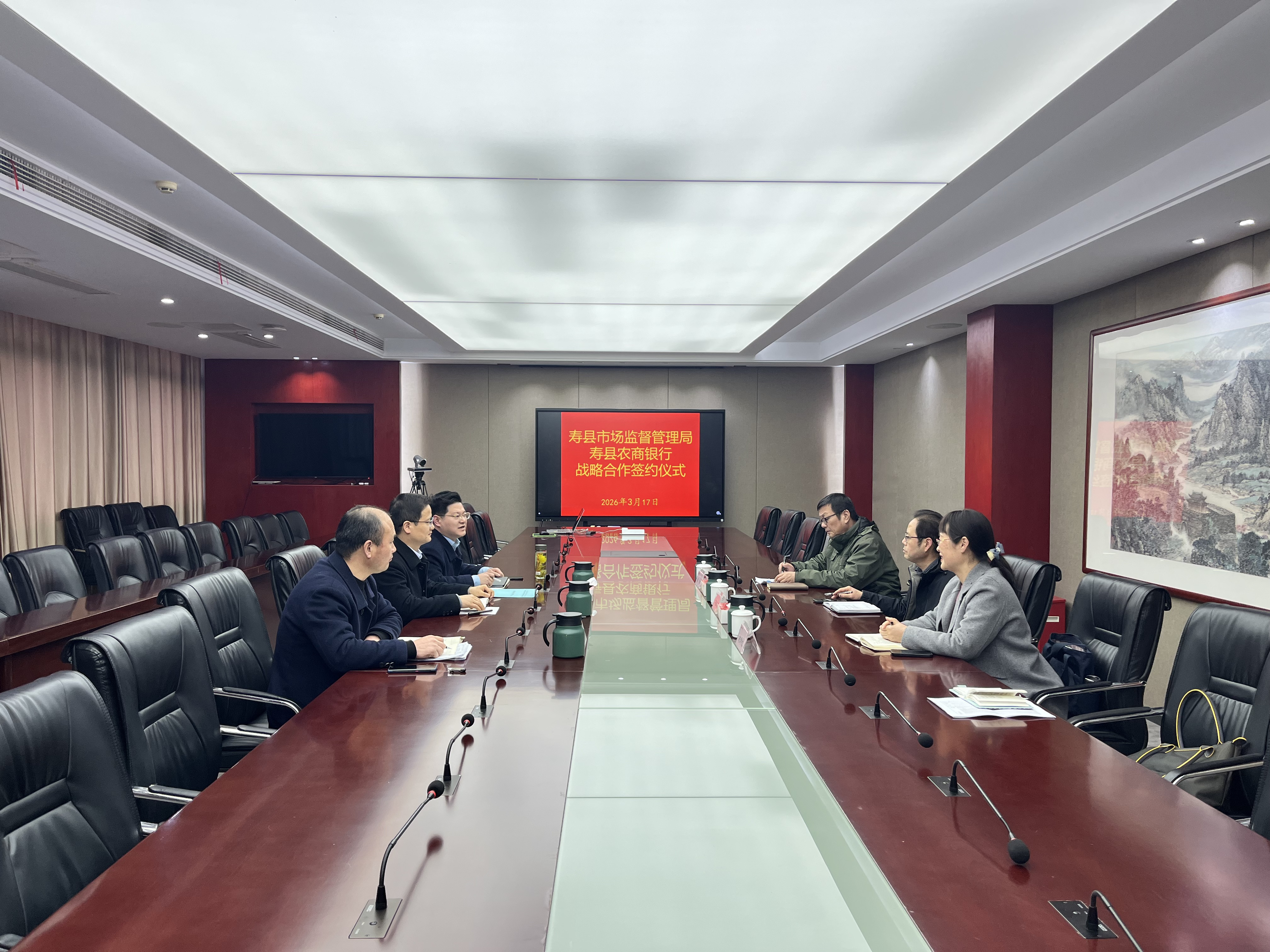 3月17日,寿县市场监管局与安徽寿县农村商业银行股份有限公司举行战略合作签约仪式,正式建立长期稳定的政银合作关系。双方将围绕知识产权金融创新、企业融资服务、信息资源共享等领域开展深度合作,共同破解中小微企业融资难题,助力县域经济高质量发展。县市场监管局、县农村商业银行主要负责人及相关业务负责人出席签约仪式。