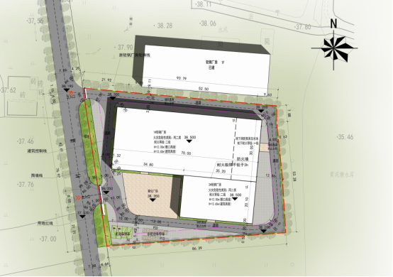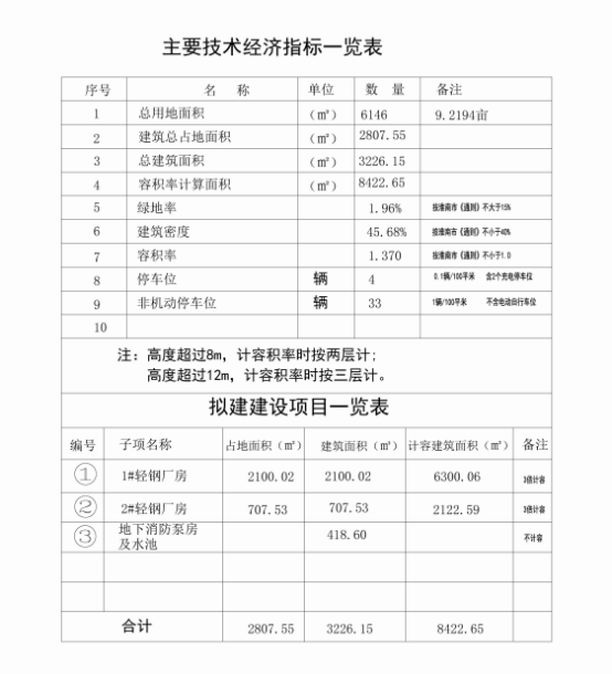 规划地段位于寿县安丰镇天岗村。规划总用地面积6146.00平方米,总建筑面积3226.15平方米,其中1#厂房建筑面积2100.02平方米(计容建筑面积6300.06平方米),2#厂房建筑面积707.53平方米(计容建筑面积2122.59平方米),地下消防泵房及水池建筑面积418.60平方米,总计容建筑面积8422.65平方米,容积率1.37,建筑密度45.68%,绿地率1.96%。机动车停车位4个(充电桩车位2个),非机动停车位33个(不含电动自行车位)。