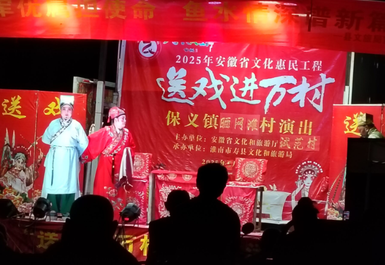 为弘扬中华民族的传统文化,丰富和活跃基层人民群众精神文化生活,助力乡村文化振兴,近日,由安徽省文化和旅游厅主办、淮南市寿县文化和旅游局承办的2025年安徽省文化惠民工程“送戏进万村”惠民演出活动在寿县保义镇各村开演,为保义镇群众带来了一场精彩纷呈的戏曲盛宴。
