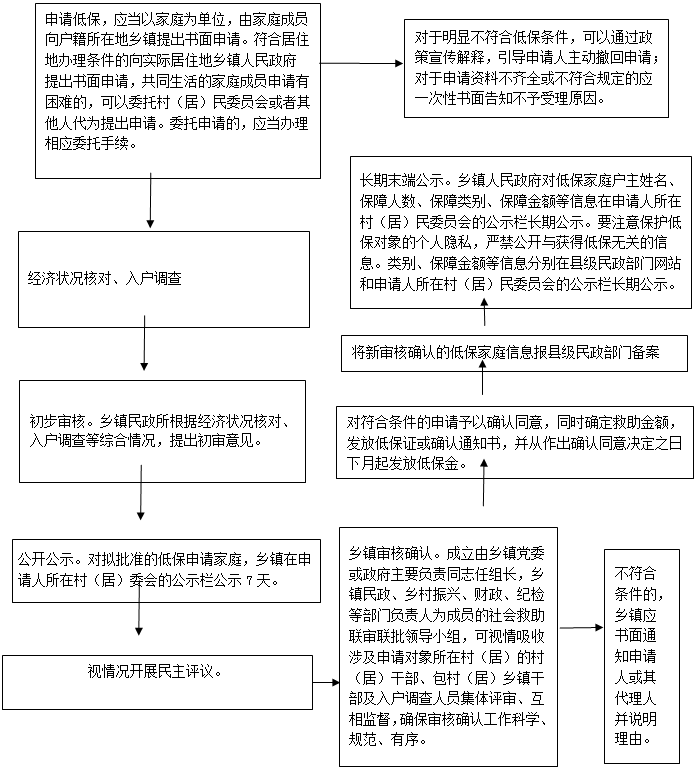 1、个人申请。以家庭为单位,由户主或其代理人向户籍所在地乡镇人民政府提出书面申请并如实提供相关证明材料,受申请人委托,村(居)委可代其向户籍所在地乡镇人民政府提交书面申请,并提供委托书和相关佐证材料、家庭经济状况核对授权书。