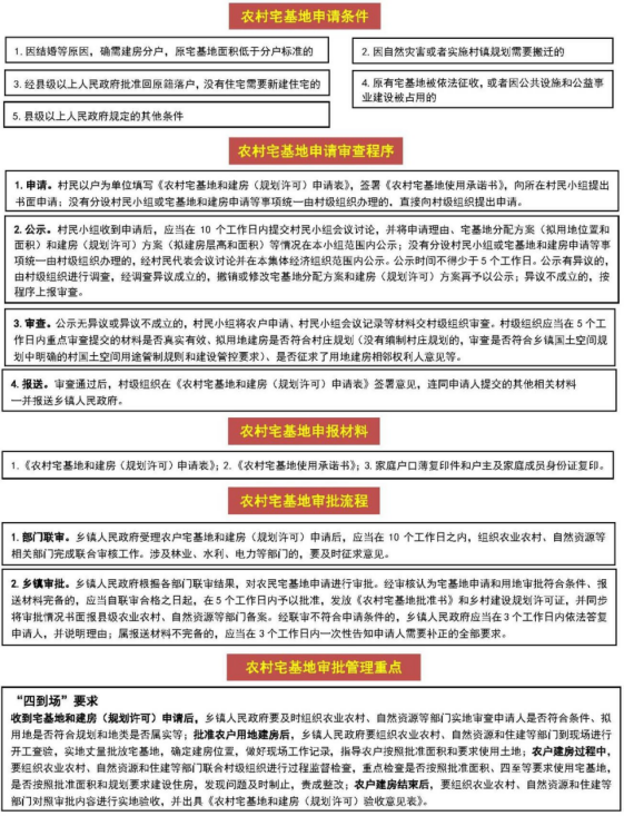 “县、乡、村”三级信息公开平台,主动将农村宅基地用地申请条件、申报审批程序、审批工作时限、审批权限等相关规定和年度用地计划向社会公开。经依法批准的农村宅基地,乡镇人民政府和村级组织应当及时公开审批结果,特别是《农村宅基地批准书》和乡村建设规划许可证。