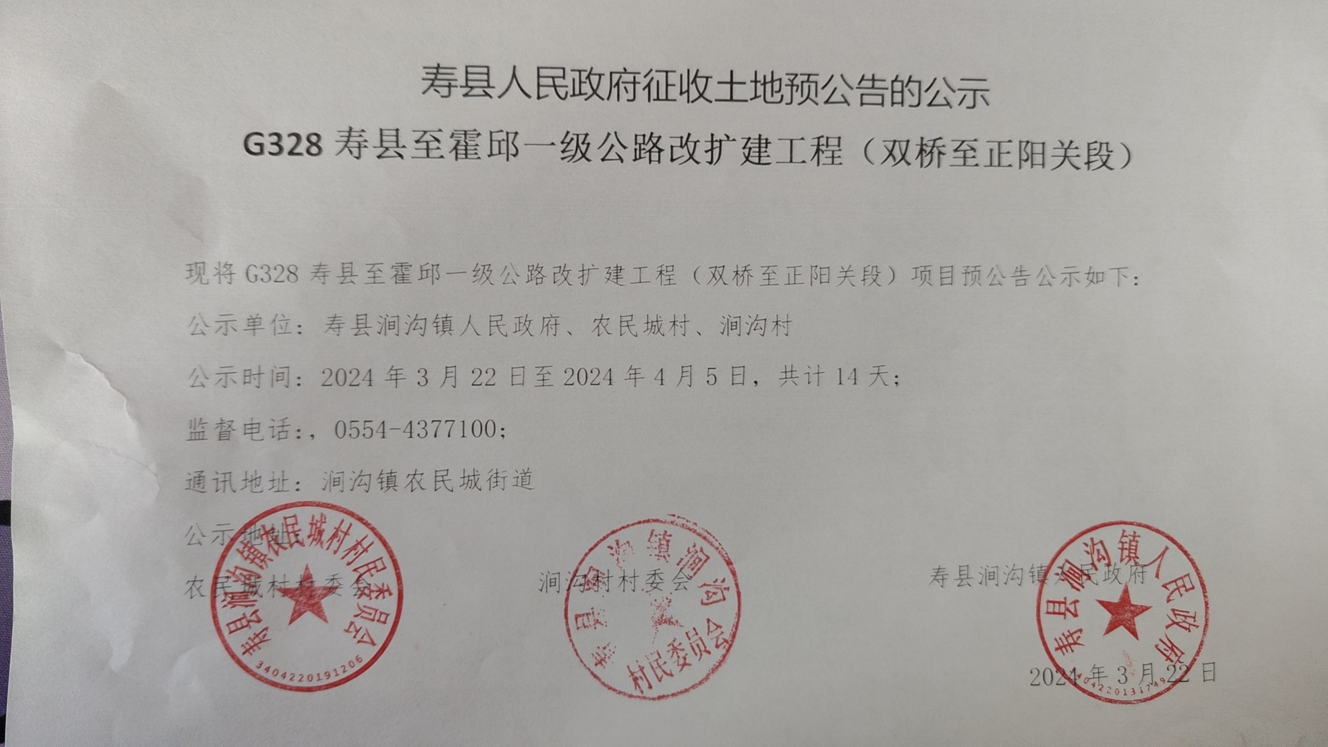 | 名称: | 寿县人民政府征收土地预公告的公示G328寿县至霍邱一级公路改扩建工程(双桥至正阳关段) | 点击量: | |