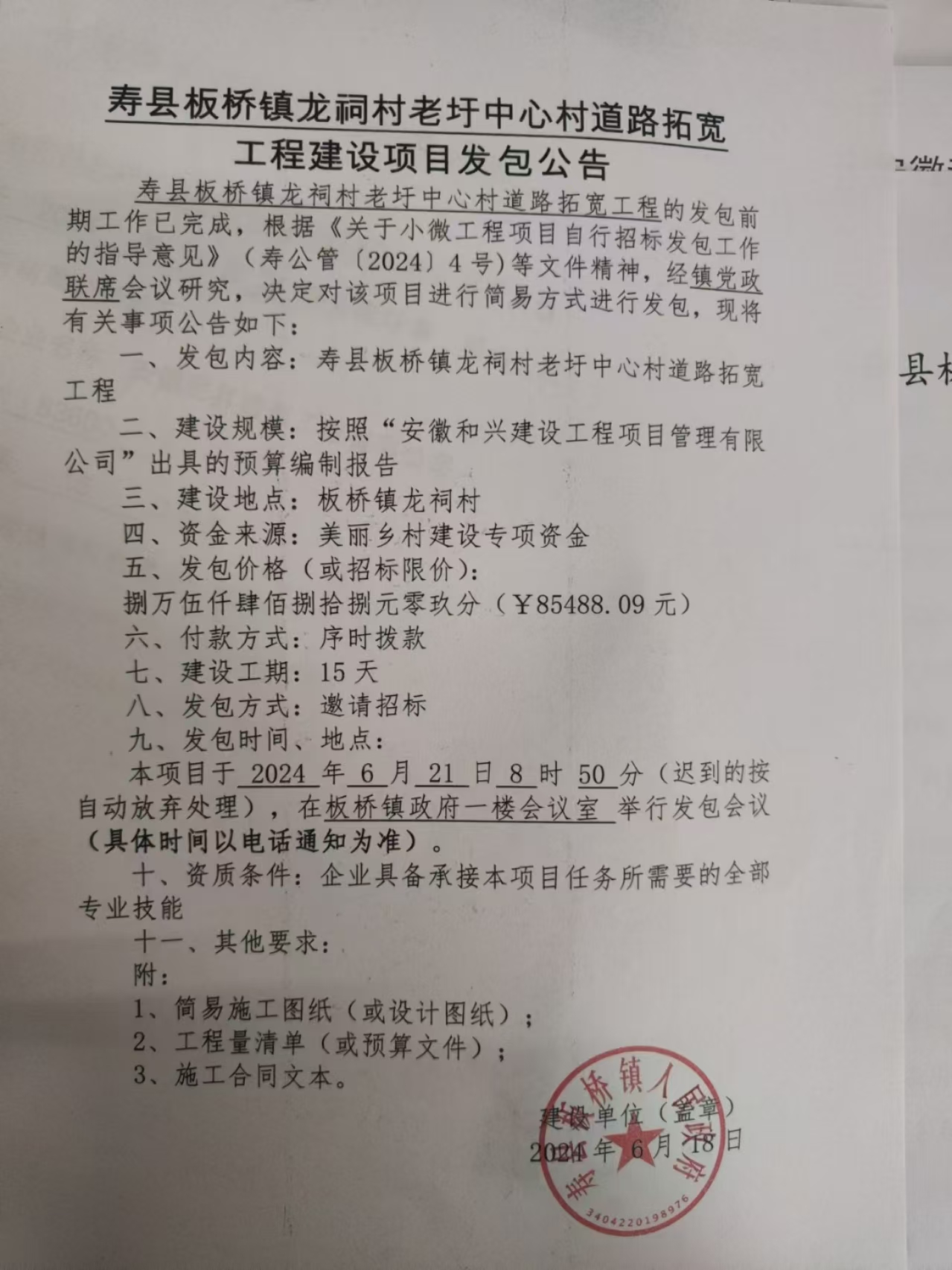 板桥镇龙祠老圩中心村道路拓宽工程建设项目预算