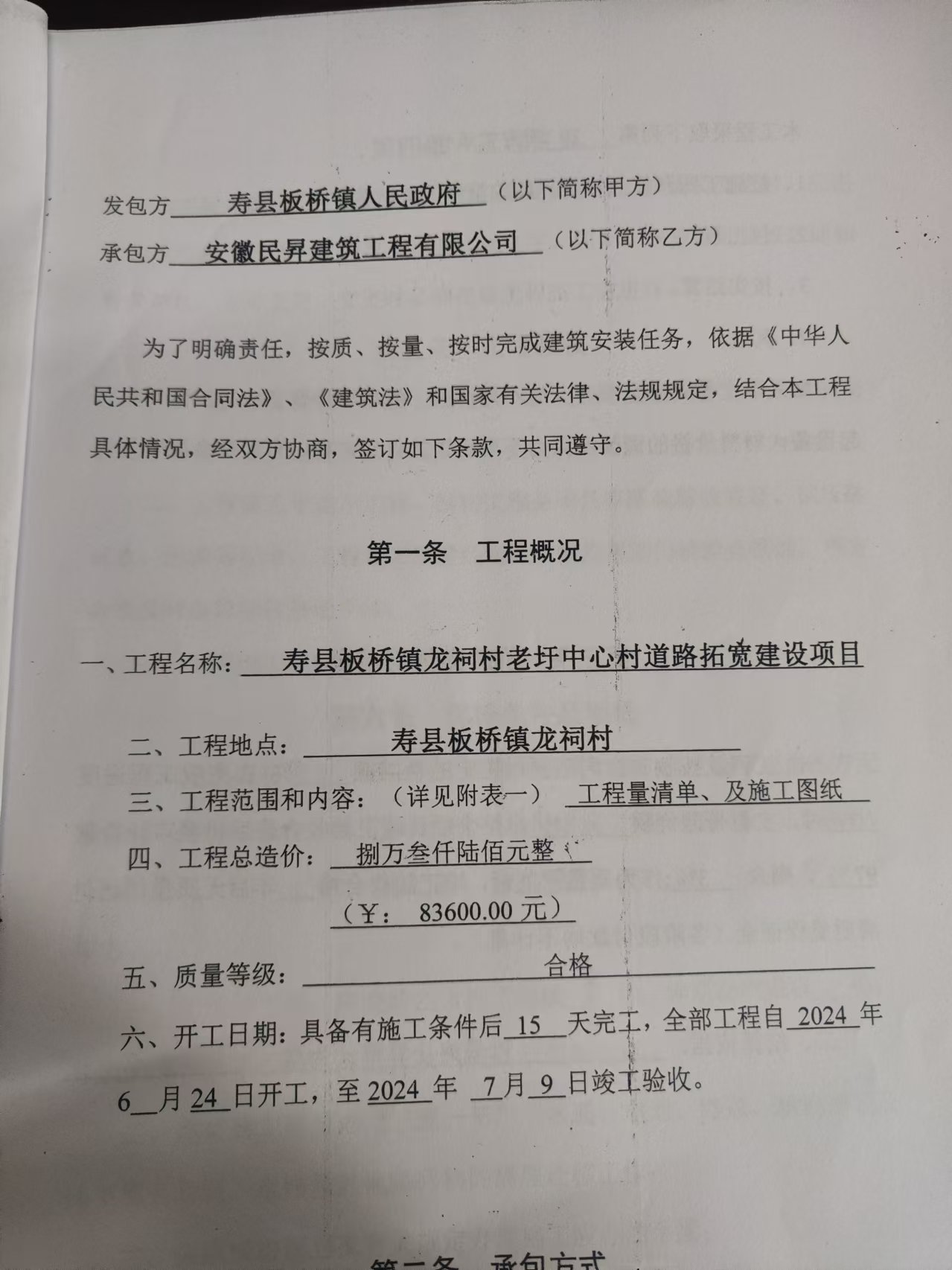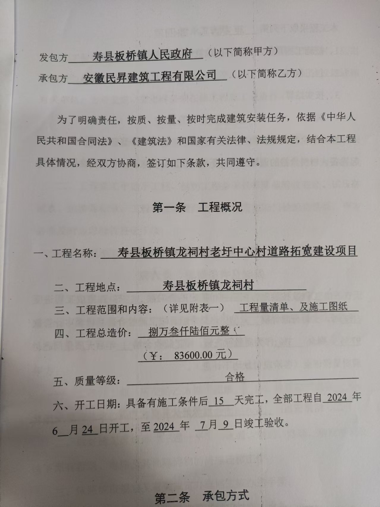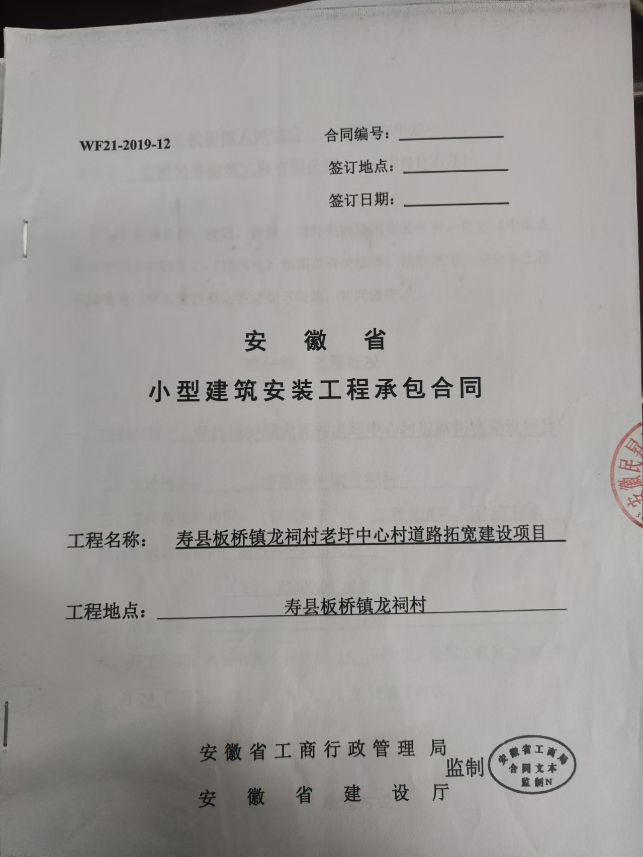 板桥镇龙祠老圩中心村道路拓宽工程建设项目合同