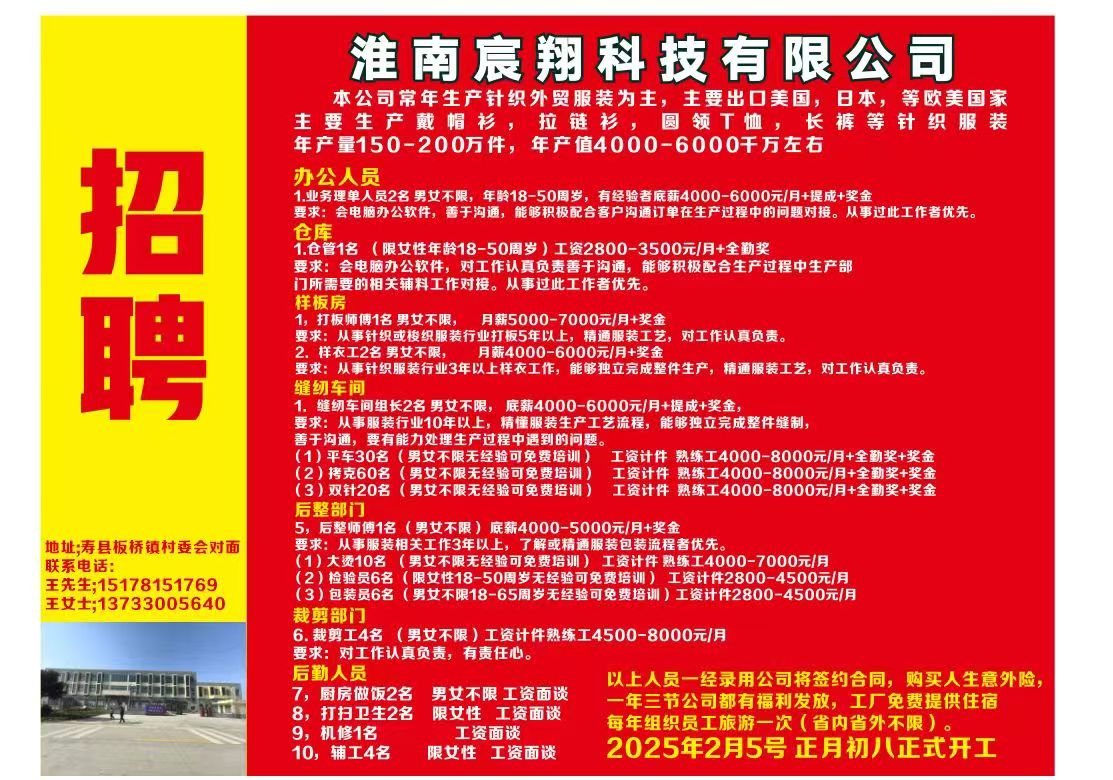 寿县板桥镇宸翔科技有限公司招工启事