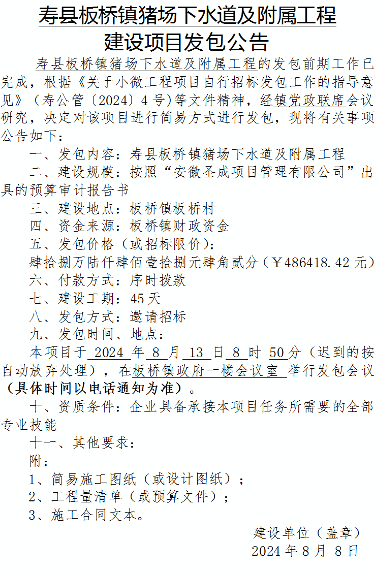 寿县板桥镇猪场下水道及附属工程建设项目预算