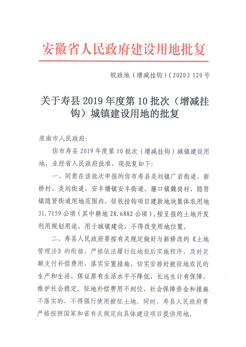 关于寿县2019年度第10批次(增减挂钩)城镇建设用地的批复(含安丰塘镇安丰街道)