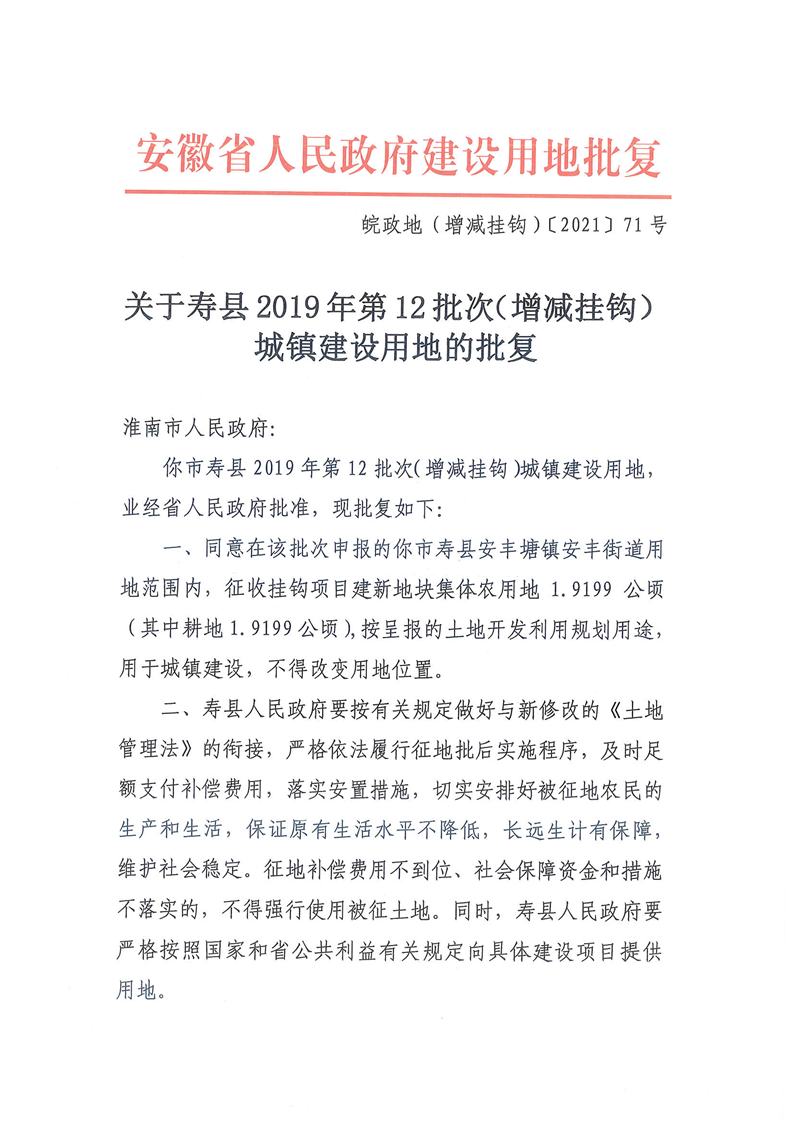 寿县2019年第12批次(增减挂钩)城镇建设用地批复(含安丰塘镇安丰街道)