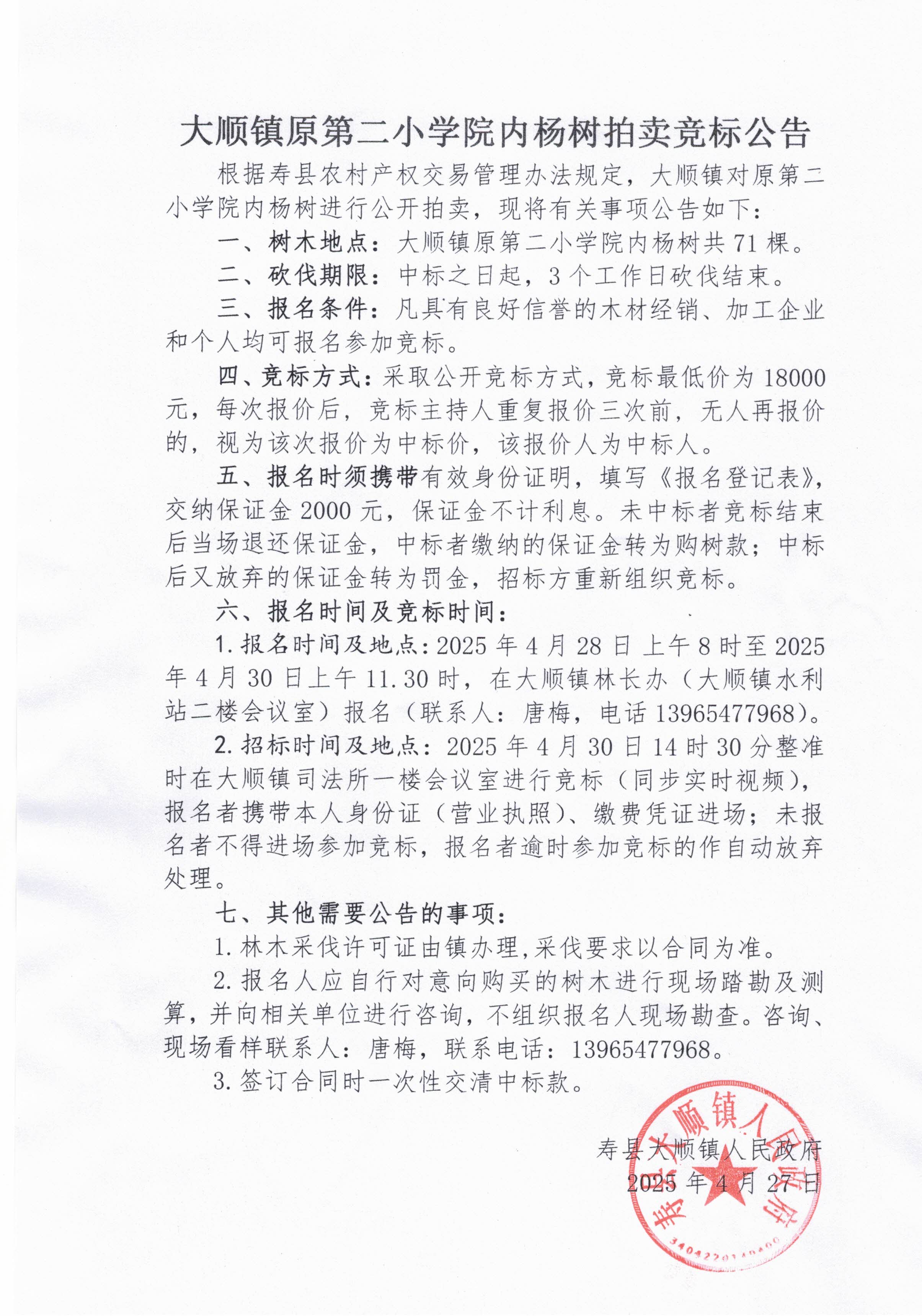 大顺镇原第二小学院内杨树拍卖竞标公告