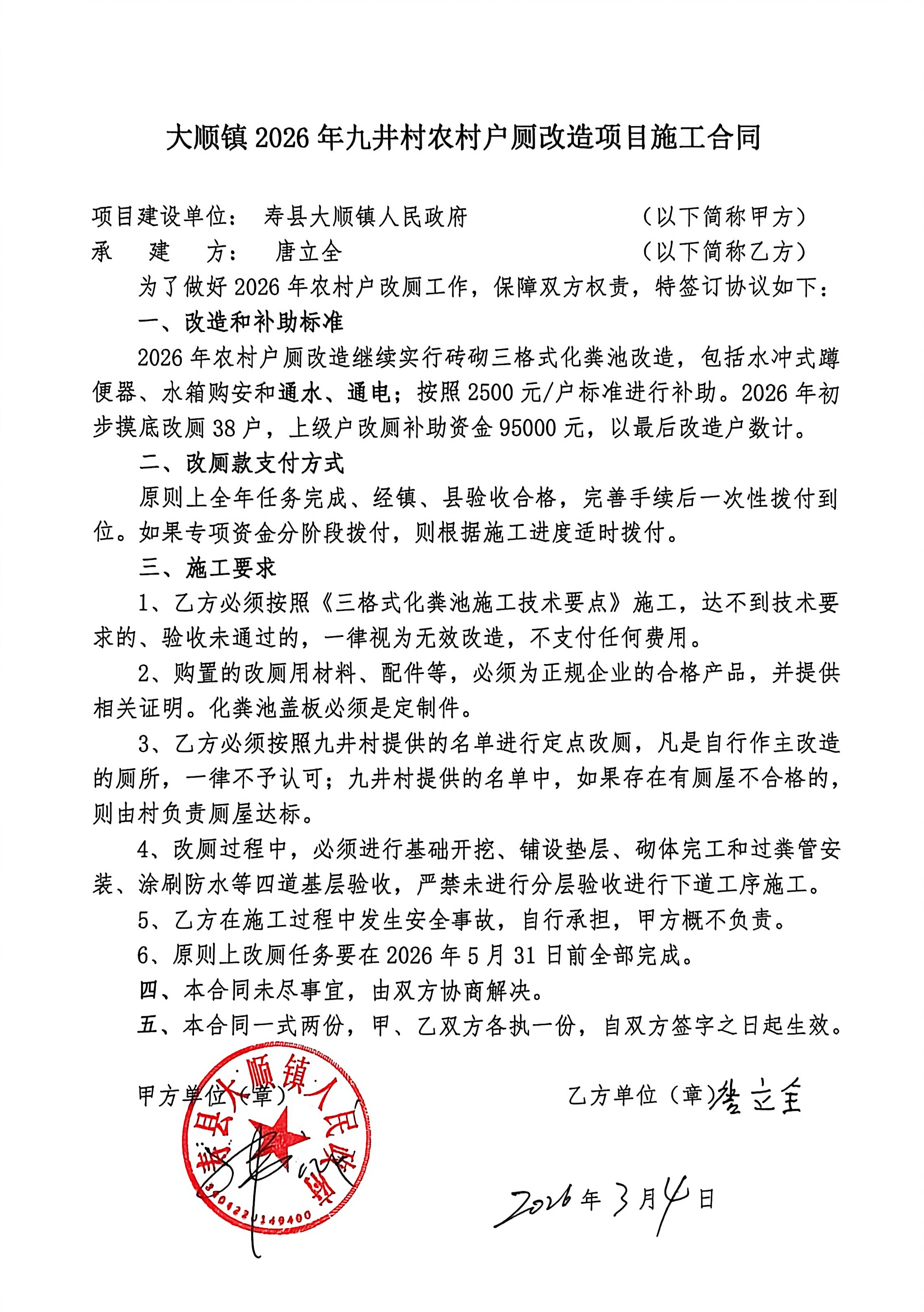 大顺镇2026年九井村农村户厕改造项目施工合同