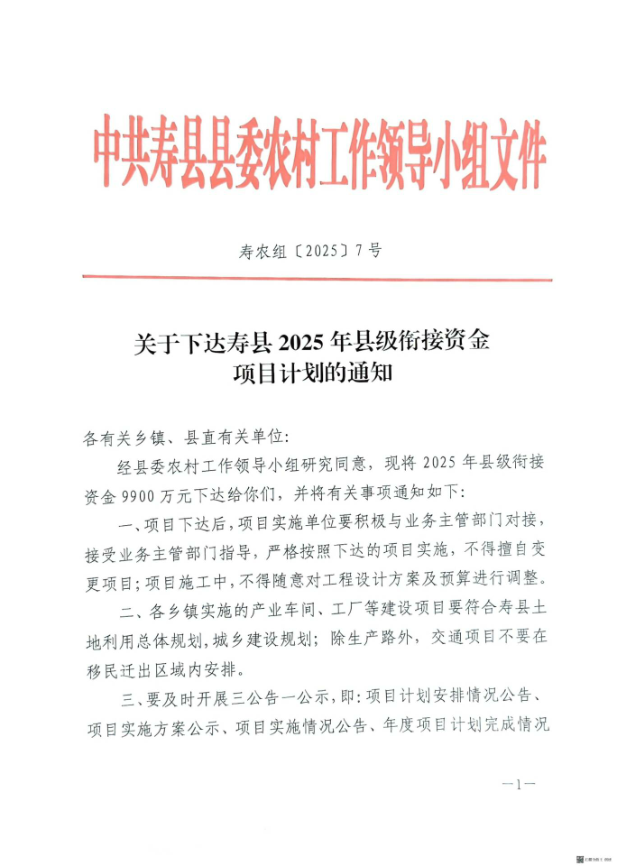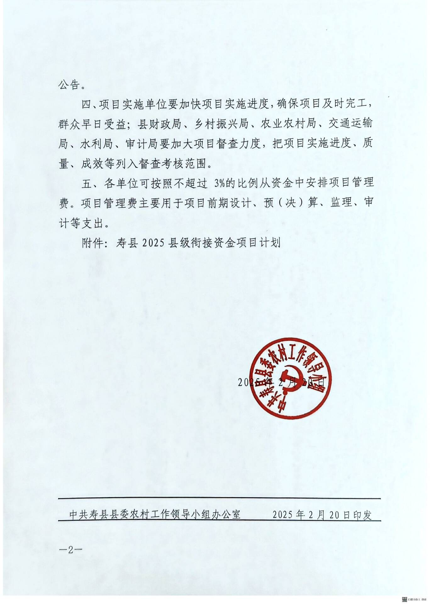 关于下达寿县2025年县级衔接资金项目计划的通知