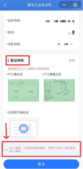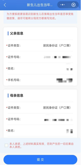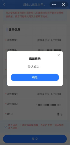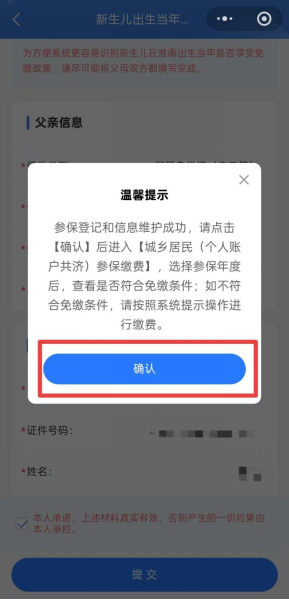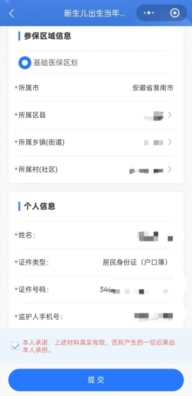 4.在新生儿参保登记界面完善新生儿参保区域信息、个人信息、父母信息,并依次上传新生儿户口簿及父母身份证材料,勾选本人承诺后,点击【提交】,待提示“登记成功”后点击【确认】。(如新生儿在淮南市已存在参保信息可直接完善父母信息和上传材料)
