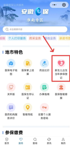 2.在“安徽医保公共服务小程序”淮南专区地市特色栏目中点击【新生儿出生当年参保登记】,进入新生儿出生当年参保登记界面。