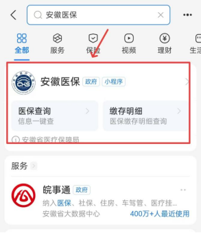 ②支付宝APP搜索“安徽医保”,点击进入“安徽医保公共服务小程序”淮南专区;