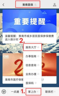 ①微信搜索关注“淮南医保”公众号,依次点击下方【掌上办】-【服务大厅】,进入“安徽医保公共服务小程序”淮南专区。