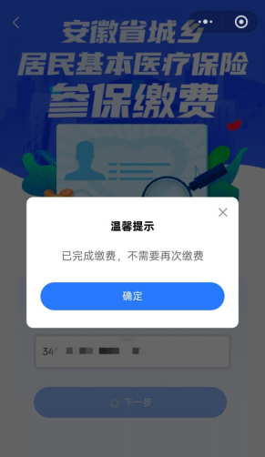 6.在年度参保缴费界面输入新生儿身份证号点击【下一步】,待系统提示“已完成缴费,不需要再次缴费”即新生儿免缴操作完成;如不符合免缴条件,请按照原渠道进行缴费。