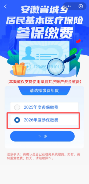 5.点击【确认】,进入【城乡居民(个人账户共济)参保缴费】界面,选择参保年度,点击【下一步】。